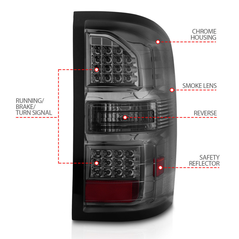 Tail Light Assembly,Guaranteed To Improve Your Vehicles Appearance. Rigorously Tested For Fit And Function. Simple Plug And Play. No Modifications Required. Easy Installation Using Common Hand Tools. Uses Stock Mounting Locations And Hardware. D.O.T. Compliant To S.A.E. Standards. Sold As A Pair.. With over 35 years of professional manufacturing experience, AnzoUSA surpasses the competition in quality, innovative styling, and product offerings. All AnzoUSA LED tail lights are 100 Percent street legal, and manufactured to the highest standards.. ANZO 2014-2018 GMC Sierra LED Tail Lights Black Housing Smoke Lens. Tail Light Assembly - LED - Chrome Housing - Smoke Lens - Pair. LED Tail Light Assembly; Smoke Lens; Black Housing; Pair;. 2 Year Warranty Covering Any Manufacturers Defects. Guaranteed To Improve Your Vehicles Appearance. Uses Stock Mounting Locations And Hardware. Easy Installation Using Common Hand Tools. Rigorously Tested For Fit And Function. D.O.T. Compliant To S.A.E. Standards. No Modifications Required. LED Tail Light Assembly. ANZO USA Tail Light Set. Simple Plug And Play. Tail Light Assembly. Tail Light Set. Sold As A Pair