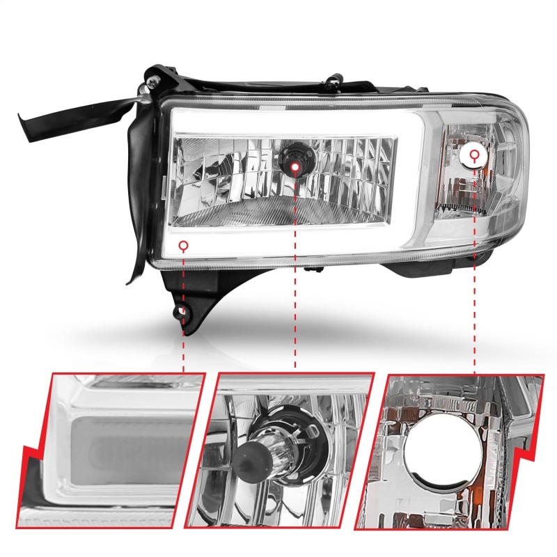 With over 35 years of professional manufacturing experience, AnzoUSA surpasses the competition in quality, innovative styling, and product offerings. All AnzoUSA LED tail lights are 100 Percent street legal, and manufactured to the highest standards.. With over 35 years of professional manufacturing experience, AnzoUSA surpasses the competition in quality, innovative styling, and product offerings. All AnzoUSA headlights are 100% street legal, and manufactured to the highest standards.. Crystal Headlight Set w/ Light Bar Style - Chrome Housing - Clear Lens - Pair. ANZO 94-02 Dodge RAM Crystal Headlight - w/ Light Bar Chrome Housing. LED Crystal Headlight Set; w/Light Bar; Chrome Housing; Pair;. LED Crystal Headlight Set. ANZO USA Headlight Set. LED Crystal Headlight. Headlight Assembly. Crystal Headlight. Head Light Set. Sold As A Pair. HdLtSet
