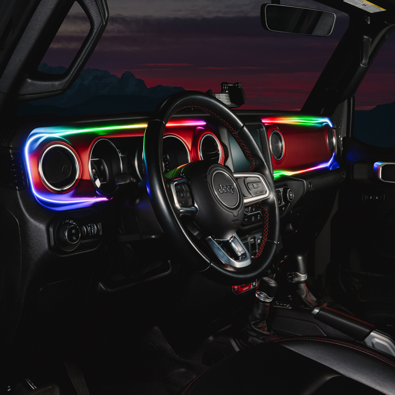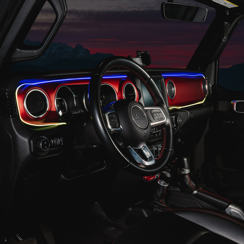 simply connect to a USB power source and start customizing. With ORACLE’s advanced Dynamic ColorSHIFT® technology, you get more than just solid colors. Choose from pre-programmed moving patterns, static color modes (including pure white), and even create your own personalized lighting effects with full pixel editing in the free Lotus LAMP app. Adjust color, speed, brightness, and color transitions to match your mood, style, or driving experience. Control your lighting easily using either the included wireless remote or the smartphone app. Whether you want subtle accent lighting or a dynamic, show-stopping display, the ORACLE Dash Kit delivers unmatched versatility and modern style.. Transform your Jeep’s Interior with Fully Dynamic LED Dash Lighting! Bring your 2018-2023 Jeep Wrangler JL’s or 2020-2023 Jeep Gladiator JT cabin to life with the ORACLE Lighting Dynamic ColorSHIFT® LED Dash Strip Kit. Designed to perfectly complement the rugged yet modern Jeep interior, this premium lighting upgrade adds immersive, customizable lighting with no complicated wiring or permanent modifications required. The ultra-slim, flexible LED strips conform seamlessly to the Jeep’s dash contours, delivering a clean, factory-installed look. Installation is effortless. In the Box: (2) Dynamic ColorSHIFT® RGB LED Dash Strips, (1) USB Connection Hub, (1) Wireless Remote, (1) Installation Tool, (1) Roll of 3M Double Sided Adhesive. Custom Pixel Editing: Create your own dynamic color patterns with adjustable speed, brightness, color transitions, and blending in the Lotus LAMP app. Easy Installation: Includes everything needed: LED strips, controller, 3M adhesive mounting tape, USB power cable, installation tool, and remote. Flexible, Low-Profile Design: Ultra-slim LED strips conform perfectly to Jeep’s dash contours for a seamless factory-style fit. Product Specs: Diameter: 2mm, Lifetime: 20,000 hours of use, Material: Polymer, Voltage: USB 5V, Warranty: 1 Year. Dynamic ColorSHIFT® Technology: Pre-programmed moving patterns, static color modes, and pure white option. ORACLE Lighting 2018-2023 Jeep Wrangler JL/Gladiator JT Dynamic ColorSHIFT LED Interior Dash Board Kit. Dual Control Options: Wireless handheld remote or smartphone control via the free Lotus LAMP app. Simple USB Power: Plug-and-play connection to your vehicle’s USB port—no hardwiring required. Oracle 18-23 Jeep Wrangler JL/Gladiator JT Dynamic ColorSHIFT LED Interior Dash Board Kit. Adjustable Brightness & Speed: Fine-tune lighting output to suit your mood or environment. 2018-2023 Jeep Wrangler JL/Gladiator JT Dynamic ColorSHIFT LED Dash Board Kit. Dash Fiber Optic Light Strip. JEEP-FIB-DASH-RGB-KIT-DC. ColorSHIFT Dynamic. Fiber Optic Kit