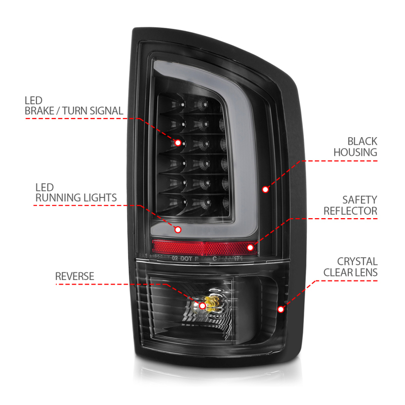 ANZO 2002-2006 Dodge Ram 1500 LED Tail Lights w/ Light Bar - Black Housing Clear Lens. Direct-fit rear LED tail lights designed to replace the factory assemblies with a modern LED light bar and improved night-time visibility.