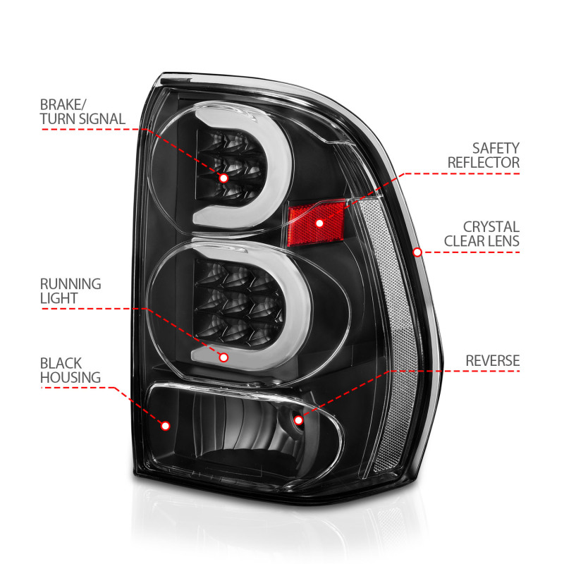 Chevrolet Trailblazer Tail Light Assembly - Rear - ANZO - LED w/ Light Bar - Black Housing Clear Lens - 02-09. These ANZO LED tail lights provide a modern light bar appearance with a direct-fit replacement for 2002–2009 Trailblazers.