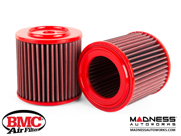 The BMC air filter is composed of a metallic mesh covered by an oiled multi-layer cotton filtration material. This guarantees a high level of filtering efficiency and a limited loss of air pressure. The oil used gives the material its "sticky" adhesive characteristic which aids in the retention of air impurities, without compromising or blocking air flow penetration. This also creates a continuous filtering process. The cotton filtrating element is contained within an external support frame which interfaces with the air box and allows it to be securely installed in the air-box. Every stage of the production process (from design to manufacturing) is carried out in Italy by Italian engineers using the finest materials.