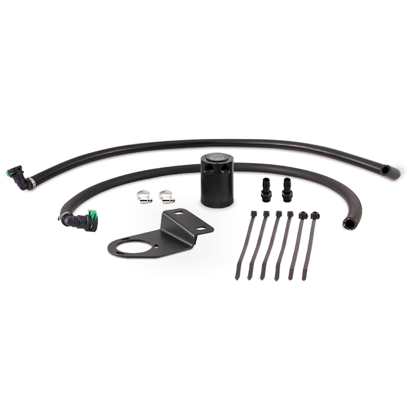 The 2019-2023 Ford Ranger is part of a new generation of American trucks. With its direct-injected, turbocharged engine and up to 7,500 lbs. of towing capacity, the 2019-2023 Ranger is focused on combining efficiency with capability. The 2.3L EcoBoost engine under the hood of the Ranger produces over 310 lb-ft. of torque to let you roam free, but the direct-injection that makes that power possible also places it at risk for carbon buildup. Blow-by is a natural occurrence in any internal-combustion engine, but direct-injected engines are particularly susceptible to the carbon buildup it can cause. Without fuel washing over the back of the engine?s intake valves, blow-by is free to accumulate and the heat of combustion eventually turns that blow-by into hard carbon deposits. As those carbon deposits build up, they rob the 2.3L EcoBoost of air, reducing power and fuel economy. If left completely unchecked, the carbon buildup can get so bad that the engine loses compression and begins to misfire. To help prevent these issues, Mishimoto has developed a direct-fit catch can kit for your 2019-2023 Ranger 2.3L EcoBoost. Our catch can intercepts the blow-by, preventing it from entering the intake and coating the intake valves. The oil, fuel, and water vapor in the blow-by is condensed by our catch can?s internal baffle and air diverters, while a 50-micron bronze filter on the outlet of the catch can removes carbon and other particulate. This system ensures that the only thing moving through your intake is clean air. As with all our direct-fit catch can kits, this 2019-2023 Ranger 2.3L EcoBoost catch can kit comes with direct-fit lines and bracket that securely mounts the catch can without any cutting or drilling. Our 2019-2023Ford Ranger 2.3L EcoBoost catch can is also backed by our Mishimoto Lifetime Warranty for a lifetime of protection.. Durable 2.5mm thick steel bracket mounts the catch can out of the way of other engine components and isolates it from engine vibration for a lifetime of service. Includes direct-fit hoses with pre-installed quick-disconnect fittings. Mishimoto 19+ Ford Ranger Baffled Oil Catch Can Kit - Black. Baffled Oil Catch Can Kit, fits Ford Ranger 2019-2023. Ford Ranger Baffled Oil Catch Can Kit, 2019-2023. Fits with stock Lariat engine cover. Mishimoto MMBCC-RGR-19PBE. Engine Oil Catch Can Kit. Oil Catch Can Kit