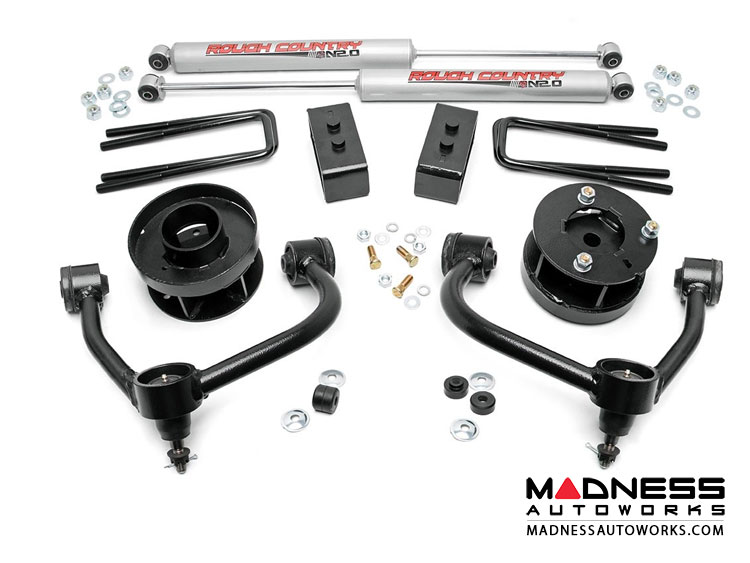 Rough Country’s 3-inch Bolt-On Kit features N2.0 Nitrogen-charged shocks, giving your truck incredible ride-quality both on and off-road. Also included are a set of durable strut spacers and fabricated rear blocks to provide lift height from front to rear. Once installed, this kit gives your truck plenty of ride height for up to 34in tires while offering a clean, level look from front to rear. Retain your stock wheels with this kit when you use Rough Country’s 0.25-inch wheel spacer.