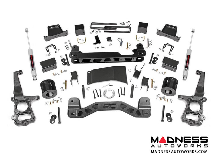 Featuring a set of durable lifted knuckles and strut spacers, you'll gain enough ride height to run up to 35-inch tires with proper wheel spacing! A set of differential drop brackets, sway-bar drop brackets, brake line brackets, and a drive shaft spacer help keep everything at optimum angles for a factory-like ride, even after lifting. A 1/4-inch thick plate steel front and rear cross member bring uncompromised strength and good looks to your truck, and are updated to fit the new F-150 design. Our Fabricated Rear Blocks offer considerably more strength than their cast iron counterparts, and were specifically engineered by Rough Country to prevent against axle-wrap.