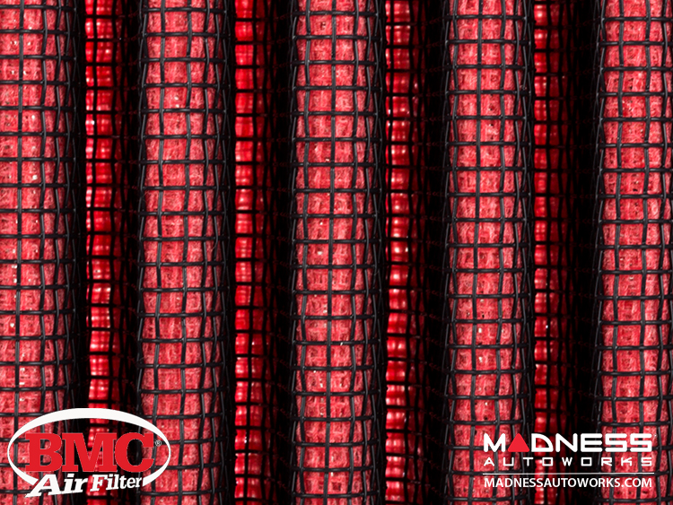 The BMC air filter is composed of a metallic mesh covered by an oiled multi-layer cotton filtration material. This guarantees a high level of filtering efficiency and a limited loss of air pressure. The oil used gives the material its "sticky" adhesive characteristic which aids in the retention of air impurities, without compromising or blocking air flow penetration. This also creates a continuous filtering process. The cotton filtrating element is contained within an external support frame which interfaces with the air box and allows it to be securely installed in the air-box. Every stage of the production process (from design to manufacturing) is carried out in Italy by Italian engineers using the finest materials.