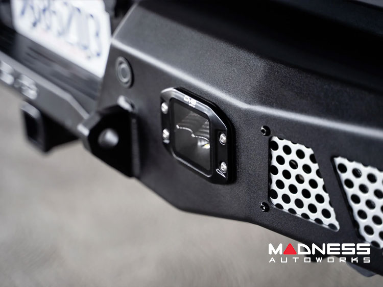 On each side of the bumper a 3” flush mount light pod can be mounted for supplemental rear lighting. If you find yourself in need of a recovery, two clevis mounts that take 3/4” D-ring shackles will have you back on your way in no time! The aluminum accent panels cut weight where it counts, and are removable and paintable if desired. Additional benefits include retaining the factory license plate lights, trailer harness, parking sensors, and compatibility with both single or dual exhaust setups. Its direct fit bolt-on installation requires no drilling and is a straightforward process as detailed in our installation guide.
