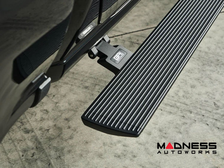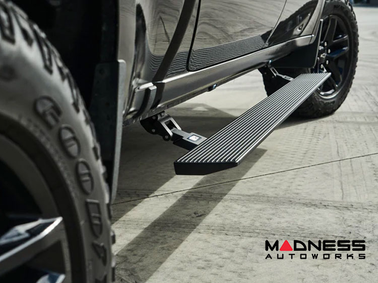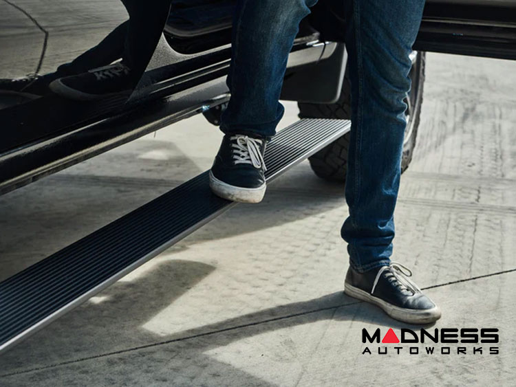 Upgrade your GMC Sierra with the ultimate combination of style and functionality with the E-Power Running Boards from Body Armor 4x4. Say goodbye to traditional side steps and hello to retractable power boards that automatically extend when your door is opened, providing a secure stepping area with its anti-slip surface. These 6" wide full cab length steps feature a low profile design for improved ground clearance while protecting the vital rocker panel of your vehicle.
