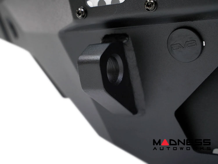 Confidently tackle the toughest trails with our updated Ford Bronco Winch Bumper - Front - MTO V2 Series by DV8. This state-of-the-art bumper is engineered for the intrepid adventurer in mind, featuring a hidden winch mount that provides discreet yet powerful recovery options while maintaining high clearance. Keep your path illuminated even in the darkest conditions with the integrated center mount for a 20-inch single row light bar and two mounts for 3-inch pod lights on either side.