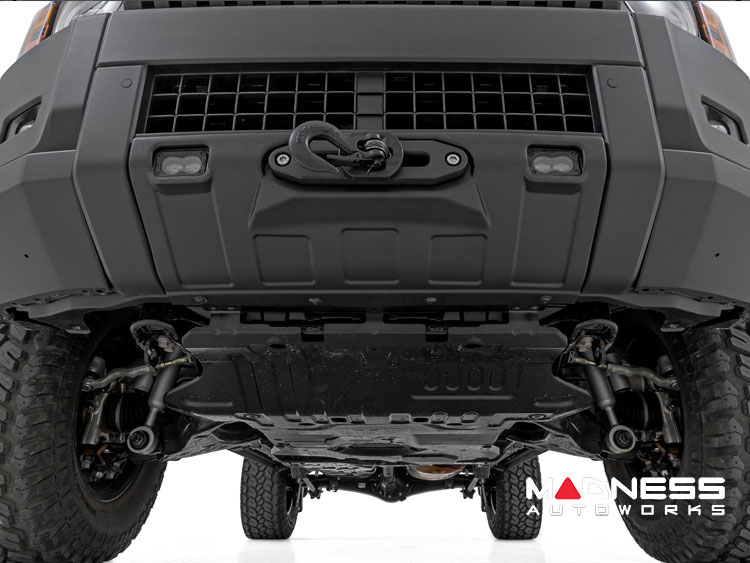 Introducing the Toyota Land Cruiser Winch Mount - Hidden - Rough Country - Yellow SAE Fog Lights. This robust winch mount enhances your Land Cruiser’s capabilities, offering a blend of strength and performance with a discreet style that doesn’t overpower its natural appearance.