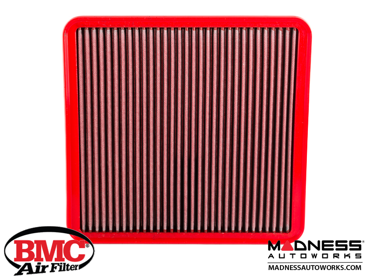 The BMC air filter is composed of a metallic mesh covered by an oiled multi-layer cotton filtration material. This guarantees a high level of filtering efficiency and a limited loss of air pressure. The oil used gives the material its "sticky" adhesive characteristic which aids in the retention of air impurities, without compromising or blocking air flow penetration. This also creates a continuous filtering process. The cotton filtrating element is contained within an external support frame which interfaces with the air box and allows it to be securely installed in the air-box. Every stage of the production process (from design to manufacturing) is carried out in Italy by Italian engineers using the finest materials.