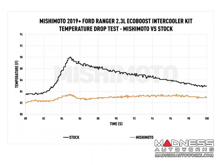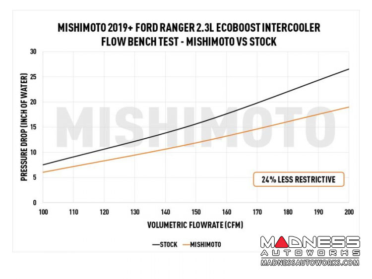 All those percentages don't just look good on paper; they also translate into power in the real world. The Mishimoto Ranger performance intercooler kit produces dyno-proven gains of 13.6 whp and 13.9 lb-ft of torque, all while maintaining less pressure drop than the stock intercooler system from inlet to outlet.