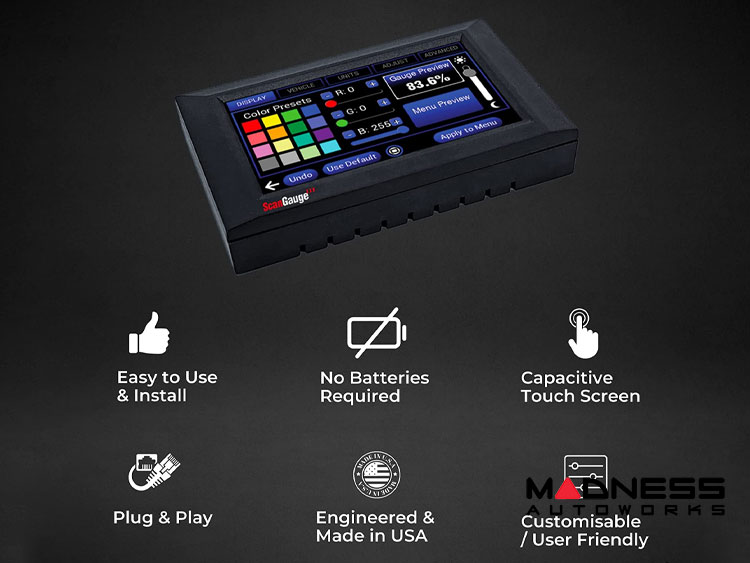 Simple touch operation allows you to quickly and easily access the powerful features of the ScanGauge. Swiping two fingers up or down will raise and lower the brightness