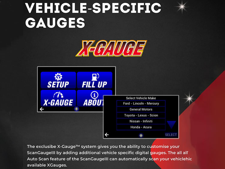 In addition to the standard set of gauges, ScanGaugeIII also includes the exclusive X-Gauge technology. With XGauge, you can add additional vehicle specific gauges automatically with it’s NEW Auto Scan for XGauges or by manually entering them.