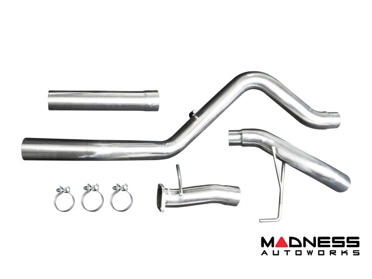 The entire length of the exhaust system was constructed from massive 3.00in mandrel-bent 304 stainless-steel tubing. This massive tubing allows those turbos to breathe and perform at their peak efficiency. The rear section consists of a race inspired 3.00in mandrel bent tube that tucks into the undercarriage for the most ground clearance possible. It's single exit, straight through tip is designed to give you the most exhaust flow and yields an aggressive, race inspired, deep exhaust tone.