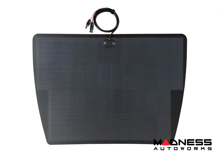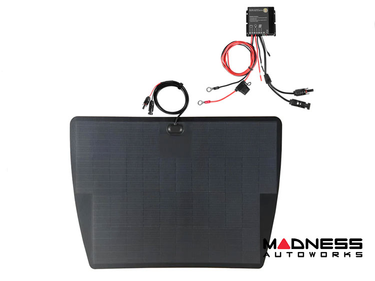 This complete kit includes a flexible 100W solar panel, a waterproof MPPT controller, and a custom-fitted hood decal to ensure secure mounting and protection for your vehicle’s paint.