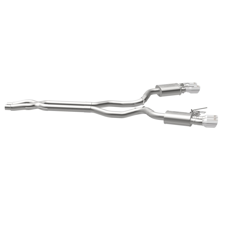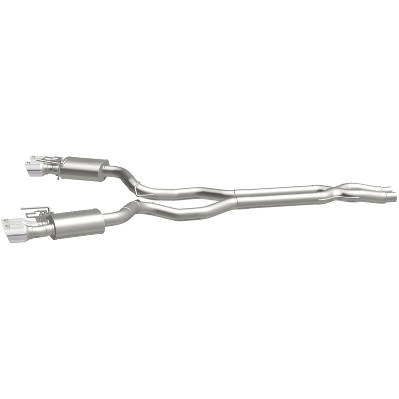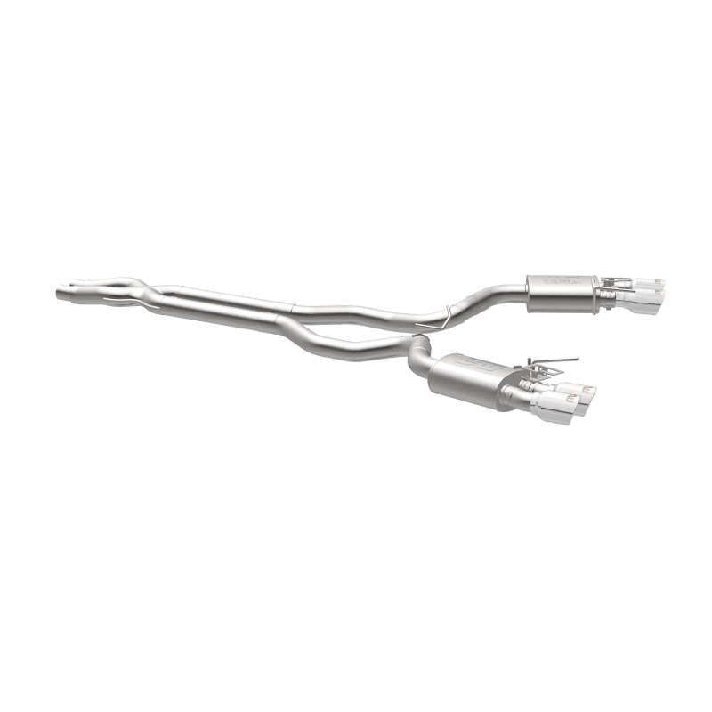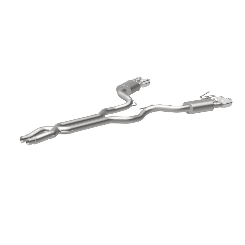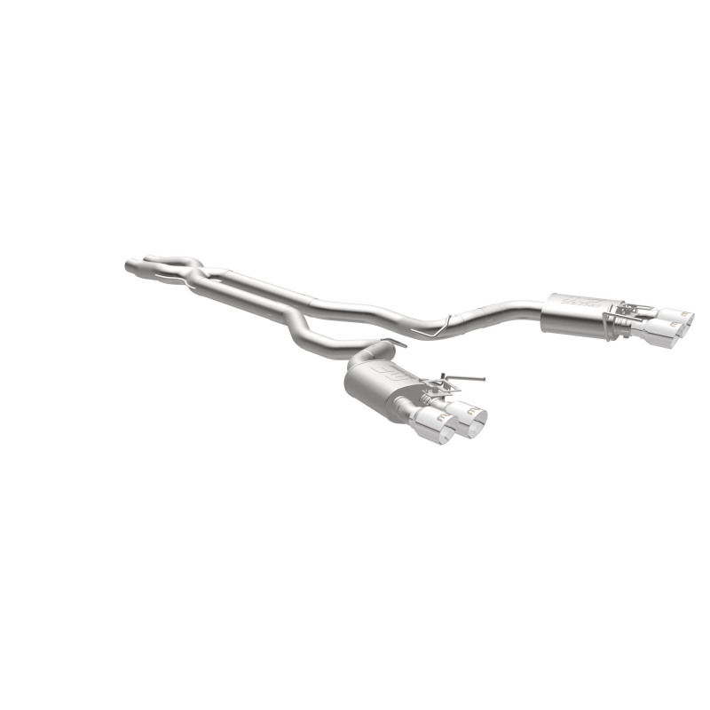 The MagnaFlow Competition Series Cat-Back Performance Exhaust System is engineered to deliver dyno-proven performance through its expertly designed structure. Utilizing high-quality 409 stainless steel, the exhaust includes fast-flowing mandrel bent 3-inch main piping, ensuring optimal airflow and performance. The system features two Straight-Through mufflers and ends with a Quad Split Rear exit. The 4-inch Polished Welded-On Double Wall Angle Cut Folded Edge tips provide a sporty and modern finish. This cat-back system replaces the vehicle's exhaust from the catalytic converter back, optimizing aggressive exterior sound levels while maintaining moderate interior noise. Designed with a direct-fit approach, it takes advantage of advanced 3D scanning techniques to ensure straightforward installation and perfect compatibility.