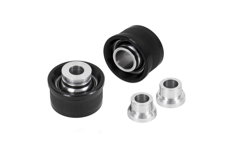 Introducing the Chevrolet Camaro Trailing Arm Bushing Kit - Rear Lower Outer - BMR Suspension - Spherical Bearings - Black - 2016. Designed to enhance the performance of your 2016 and newer Chevrolet Camaro, this kit from BMR Suspension is perfect for drivers looking to improve rear stability and minimize wheelhop by eliminating bushing deflection in the rear lower trailing arm.