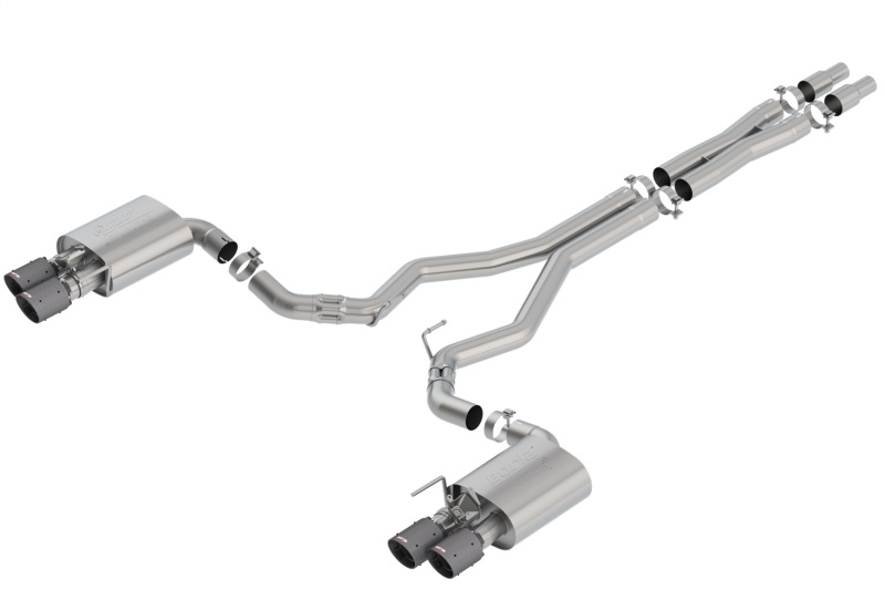 System will fit Bullitt models. NOT recommended for use on Convertibles. This 3" diameter high flow Cat-Back(tm) system was designed specifically for the Mustang GT and has Active Exhaust Valves. The system contains a Merge X-Pipe for increased performance and improved sound. The system has Borla(r)'s Polyphonic Exhaust Harmonizer Technology with utilizes patented units that contain pipes of different diameters and lengths to create multiple exhaust notes that harmonize to deliver a clean, rich, full-bodied sound to the Borla(r) mufflers. The mufflers then enhance this sound to the character and volume of the aggressive ATAK(r) sound, with no drone inside the vehicle. The exhaust exits thru dual 4" round carbon fiber with black anodized center tips on each muffler. Systems with bright chrome on T-304 stainless steel tips, and black chrome on T-304 stainless steel tips are also available. Borla(r) Cat-Back(tm) and Axle-Back multi-core technology is designed to unleash hidden horsepower. Increased exhaust velocity adds power, driving excitement, fuel economy, and the distinctive Borla(r) Sound of Power respected by motoring enthusiasts everywhere. Each system is built from premium T-304 stainless steel, superior to T-400 series knockoffs (such as 409), to give you the absolute best in performance and durability. Ultra-smooth mandrel bends ensure maximum flow & power, and precision computer numerical control (CNC) manufacturing ensures an accurate fit. Best of all, Borla(r) stands behind every system with a Million-Mile Warranty. Just what you'd expect from the world's most experienced (and most winning) exhaust brand.. ATAK(r) Cat-Back(tm) Exhaust System 2018-2023 Ford Mustang GT (Incl. Bullitt Models) 5.0L V8 Automatic/ Manual Transmission Rear Wheel Drive 2 Door With Active Valve Performance Exhaust. NOT Recommended Convertible.. 2018-2023 Ford Mustang GT (Incl. Bullitt Models) 5.0L V8 Automatic/ Manual Transmission Rear Wheel Drive 2 Door With Active Valve Performance Exhaust. NOT Recommended For Convertible.. Borla 2018 Ford Mustang GT 5.0L AT/MT 3in Atak Catback Exhaust w/ Valves (Carbon Fiber Black Tip). System features Polyphonic Harmonizer technology. System features Sound Suppressing Exhaust Valves. Cat-Back(tm) Exhaust System - ATAK(r). NOT recommended for Convertibles. System contains a Merge X-Pipe. BORLA Cat-Back System. Exhaust System Kit. 3" diameter system. Cat-Back System