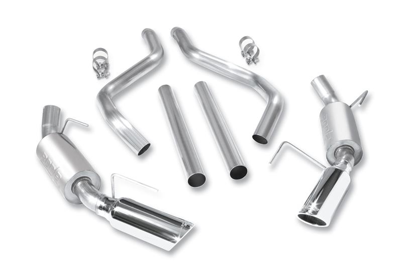 The BORLA® sound of power. Its been described as asonic shot of adrenaline. An intoxicating concert ofsteel, gears and combustion that echoes from thespeedways, deserts and highways of the world.The sound of more victory laps than any otherbrand, the BORLA® exhaust note has become the quintessentioal soundtrack of high-performance motoring. And like all good automotive designs there is function behing the form. As any driving enthusiast knows, the sound of an exhaust provides more than just ear candy. Its a communications conduit between car and driver. A link between human and machine. The exhaust sound provides accoustic feedback of engine rpm to aid the driver in critical decisions such as gear selection or throttle input in rev-match shifting. At BORLA®, we understand this concept better than any exhaust manufacturer. Combining patented technology with computer modeling, extensive prototyping and advanced sound analysis tools. BORLA® engineers spend countless hours tuning exhaust systems to best reflect the personality and performance of vehicle applications. The result is an enhanced driving experience. With unrivaled clarity, the BORLA® exhaust note can help a driver stay within the powerband through a difficult section, using the exciting sensory feedback of sound. With unrivaled clarity the Borla exhaust note can help a driver stay within the powerband through a difficult section, using the exciting sensry feedback of sound.. Borla(r) has developed a revolutionary exhaust technology that enables our engineers to deliver unprecedented vehicle-specific control over the acoustical note of an exhaust throughout the RPM range, while retaining 100% of the power-adding capabilities of Borla(r)'s patented multicore design. Called ATAK(r) (Acoustically-Tuned Applied Kinetics), this technology produces the highest available dB (decibel) levels in the Borla(r) street-legal lineup, and is designed for high-performance purists who prefer exhaust notes over their stereos. The focus of ATAK(r) is to pump the volume while retaining clarity of sound, avoiding distortion typically found in louder exhausts. With ATAK(r), the sound output is tuned like a graphic equalizer to shape and focus sound waves for optimum high-volume output. The development of each ATAK(r) system begins with extensive study of each vehicle's acoustical properties. The technology is based on custom-tuned attributes of the internal muffler cores, which are calibrated on a vehicle-by-vehicle basis to deliver the most desirable sound. Like all Borla(r) exhaust products, each system is handmade in the USA by master craftspeople and features premium, high-quality T-304 austenitic stainless steel construction, ultra-smooth mandrel bent piping, 4" bright chrome on T-304 stainless steel tips, and a Million-Mile Warranty.. ATAK(r) Axle-Back Exhaust System 2005-2009 Ford Mustang GT 4.6L V8/ 2007-2009 Ford Mustang Shelby GT500 5.4L V8 Supercharged Automatic/ Manual Transmission Rear Wheel Drive 2 Door Coupe/ Convertible.. 2005-2009 Ford Mustang GT 4.6L V8/ 2007-2009 Ford Mustang Shelby GT500 5.4L V8 Supercharged Automatic/ Manual Transmission Coupe/ Convertible.. Borla 05-09 Ford Mustang GT/Bullitt ATAK Catback Exhaust. Cat-Back(tm) Exhaust System - ATAK(r). Cat-Back™ ATAK System. Million Mile Warranty. Borla Cat-Back System. Exhaust System Kit. Cat-Back System. ExhstSysKt