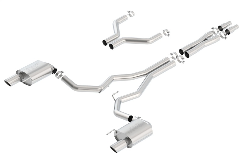 EXCEPT convertible. Recommended only for vehicles with substantial engine upgrades that require a 3" exhaust. System contains a merge X-Pipe for increased performance and improved sound. This system features bright chrome on T-304 stainless steel tips. Borla(r) Cat-Back(tm) & Axle-Back exhaust systems feature patented straight-through and multi-core technology designed to unleash hidden horsepower. Increased exhaust velocity adds power, driving excitement, fuel economy, and the distinctive Borla(r) Sound of Power respected by motoring enthusiasts everywhere. Each system is built from premium T-304 stainless steel, superior to T-400 series knockoffs (such as 409), to give you the absolute best in performance and durability. Ultra-smooth mandrel bends ensure maximum flow & power, and precision computer-controlled CNC manufacturing ensures an accurate fit. Best of all, Borla(r) stands behind every system with a Million-Mile Warranty. Just what you'd expect from the world's most experienced (and most winning) exhaust brand.. Borla Cat-Back and Rear Section exhaust systems feature patented straight through and multi-core technology to unleash hidden horsepower. Increased exhaust velocity adds power; driving excitement; fuel economy; and the distinctive Borla Sound of power respected enthusiasts everywhere. Each system is built from premium 300 series austenitic stainless steel; superior to T-400 series knockoffs; to give you the absolute best in performance and durability. Ultra smooth mandrel bends ensure maximum flow and power; and precision computer controlled CNC manufacturing ensures an accurate fit. Best of all Borla stands behind every system with a Million-Mile Warranty. Just what you would expect from the worlds most experienced and most winning exhaust brand.. S-Type Cat-Back(tm) Exhaust System For 2015-2017 Ford Mustang GT 5.0L V8 Automatic/ Manual Transmission Rear Wheel Drive 2 Door EXCEPT Convertible.. 2015-2017 Ford Mustang GT 5.0L V8 Automatic/ Manual Transmission Rear Wheel Drive 2 Door Except Convertible.. Borla S-Type Cat-Back 15-17 Ford Mustang GT 5.0L V8 MT/AT 3in pipe 4in tip. Cat-Back(tm) Exhaust System - S-Type. S-Type; Cat-Backâ„¢ System. Million Mile Warranty. Borla Cat-Back System. Exhaust System Kit. Cat-Back System. ExhstSysKt