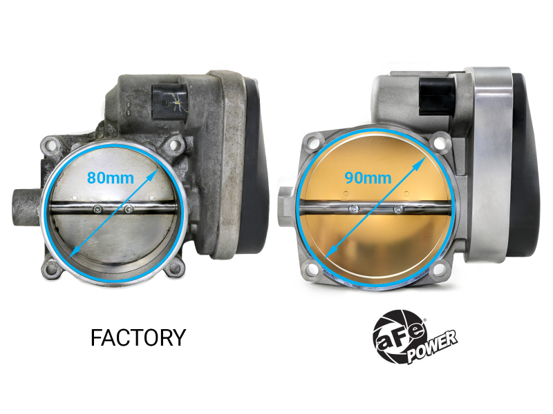 This aFe POWER 90mm Throttle Body and adapter kit improves engine air flow over the stock 80mm throttle body. The extra air flow will increase horsepower and throttle response. Performance gains will be more noticeable as more upgrades are added to the vehicle. All adapters are constructed from 6061-T6 billet aluminum and are precision machined for light weight, high strength, and perfect fit and finish. The Serrated/Swirl combination design creates intake turbulence in the combustion chamber which breaks up the fuel creating a more complete combustion cycle increasing horsepower, torque and improving throttle response. This aFe POWER 90mm throttle body kit uses all factory mounting locations providing stability and a hassle-free installation. All needed hardware is included with the kit.. aFe POWER 90mm Throttle Body Dodge Challenger 08-12/ Charger 06-12/ Chrysler 300 05-12 V8-5.7L/6.1L/6.4L. aFe 08-12 Dodge Challenger / 06-12 Dodge Charger 90mm Throttle Body. More Power and Better Throttle Response. Direct Bolt-On For Simple Installation. aFe POWER 90mm Throttle Body. aFe POWER Throttle Body. Plug-n-play Electronics. Billet Aluminum Adapter. 90mm Bore Diameter. No Tuning Required. Gasket Included. Throttle Body