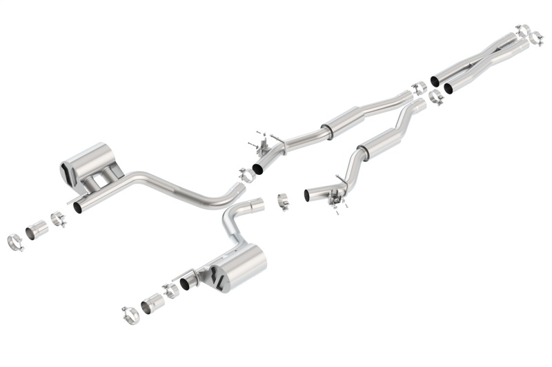 This 2.75" diameter Cat-Back(tm) system features a Merge X-Pipe for increased performance and improved sound. BORLA(r) system is equipped with MDS (multi-displacement system) valve simulators which ELIMINATE the MDS valves. This avoids any warning lights on the dash while providing maximum flow at all times. The system delivers the classic S-Type sound with no drone inside the vehicle. Tips NOT included. Use factory valance / tips. BORLA(r) Cat-Back(tm) & Axle-Back exhaust systems feature patented straight-through and multi-core technology to unleash hidden horsepower. Increased exhaust velocity adds power, driving excitement, fuel economy, and the distinctive BORLA(r) Sound of Power respected by motoring enthusiasts everywhere. Each system is built from premium T-304 austenitic stainless steel, superior to T-400 series knockoffs (such as 409), to give you the absolute best in performance and durability. Ultra-smooth mandrel bends ensure maximum flow & power, and precision computer numerical control (CNC) manufacturing ensures an accurate fit. Best of all, BORLA(r) stands behind every system with a Million-Mile Warranty. Just what you’d expect from the world’s most experienced (and most winning) exhaust brand.. 2015-2023 Dodge Challenger SRT/ 392 Hemi/ Scat Pack 392 6.4L V8 Automatic/ Manual Transmission Rear Wheel Drive 2 Door With MDS (cyl. deactivation) Valves. Borla(r) System Includes Valve Simulators. System Does NOT Include Tips Use Factory Bezel/ Valance.. S-Type Cat-Back(tm) Exhaust System 2015-2022 Dodge Challenger SRT/ 392 Hemi/ Scat Pack 392 6.4L V8 Auto./ Man. Trans. RWD 2 Door With MDS (cyl. deactivation) Valves. Borla(r) System Includes Valve Simulators. Use Factory Bezel/ Valance.. Borla 15-16 Dodge Challenger SRT 392 S-Type Catback Exhaust Single Split Rear Exit (No Tip). System does NOT include tips. Use factory Bezel/ Valance. This system INCLUDES Active Valve SIMULATORS. Cat-Back(tm) Exhaust System - S-Type. System contains a Merge X-Pipe. BORLA Cat-Back System. Exhaust System Kit. Cat-Back System