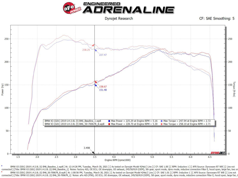 This 7-1/2” tall 360-degree radial flow air filter features a 4” round flange and our oiled Pro 5R media with five layers of progressively finer cotton gauze media for maximum airflow and performance. This media is best for street and track use. The smooth one-piece sealed housing, constructed of heat-resistant XLPE (cross-linked polyethylene) polymer, features our patent-pending filter-to-housing interface. A large, clear sight window allows for hassle-free filter inspection, without having to disassemble your system. The Momentum intake is designed to fit with the factory strut brace, with no modification necessary. This system features a high quality, computer-designed, dyno-tuned intake tube to achieve maximum power gains while maintaining a perfect fit. Its XLPE material is heat-soak resistant and extremely durable. This intake is designed to use factory mounting locations, minimizing the use of unnecessary hardware, ensuring a perfect fit every time. Its revolutionary design, featuring our patent pending filter-to-housing interface uses half the number of parts of a traditional cold air intake system. Stainless-steel worm clamps are included for strength, and a premium bellows coupling allows for ample flexibility. Momentum GT intakes are designed with fewer parts for a fast and easy installation.. Momentum GT Cold Air Intake System w/ Pro 5R Filter BMW 530i (G30) 17-23 L4-2.0L (t) B46/B48. Innovative Filter-to-Housing Interface and Minimal Hardware for Fast & Easy Installation. aFe Momentum GT Cold Air Intake System w/Pro 5R Filter 17-21 BMW 530 L4-2.0L. Clear Sight Window for Convenient Filter Inspection Without Disassembly. Utilizes Factory Mounting Locations for an Easy and Secure Installation. Washable and Reusable Pro 5R Air Filter for Maximum Performance. Momentum GT Cold Air Intake System w/ Pro 5R Filter. Dyno-Proven Gains up to +5 HP & +8 Lbs. x Ft. TQ. Momentum GT Cold Air Intake System. Measured Flow: 255 CFM @ 7” H20. Outflows Factory Intake by 28%. Momentum GT Intake