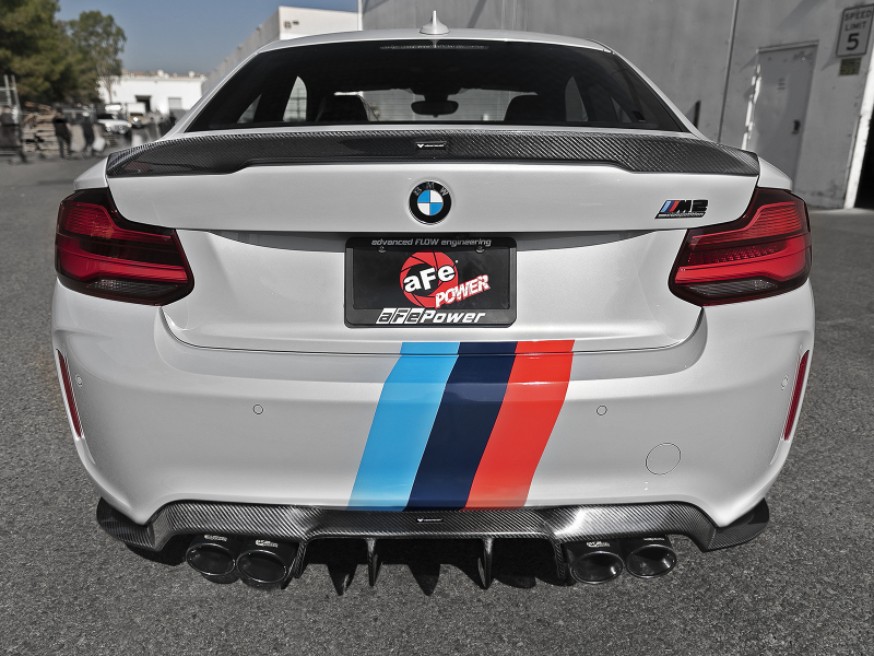 This cat-back exhaust system is constructed of 3 IN - 2-1/2 IN mandrel-bent brushed finished 304 stainless steel tubing for maximum strength and durability. This system features a high-flow stainless steel muffler, producing a mild sound. Muffler finish may vary. Finishing off this exhaust system are quad 4 IN diameter black 304 stainless steel exhaust tips. The tips features a laser etched aFe POWER logo for a unique style. This system produces an aggressive sound unleashing all available horsepower and torque. Requires cutting factory exhaust. Utilizing factory style hangers this system mounts directly to factory mounting locations for a hassle-free installation. This system incorporates a factory style exhaust valve which use the factory exhaust valve motor (not included). The valve helps regulate, direct and control the flow of exhaust gases by opening, closing, or partially obstructing passageways depending on throttle position for maximum performance. A mitered merge collector is used to decrease turbulence and increase exhaust velocity resulting in increased horsepower, torque and improved throttle response. State-of-the-art computer-aided design technology is utilized for precise vehicle fitment. 100% TIG-Welded for race-proven strength and durability.. MACH Force-Xp 3 to 2-1/2 IN Stainless Steel Cat-Back Exhaust System w/Black Tip BMW M2 Competition (F87) 19-21 L6-3.0L (tt) S55. Constructed from 3 IN - 2-1/2 IN Mandrel-Bent Brushed Finished 304 Stainless Steel Tubing. aFe MACHForce XP Exhausts Cat-Back SS 19-21 BMW M2 Competition L6-3.0L w/Black Tips. MACH Force-Xp 3 to 2-1/2 IN Stainless Steel Cat-Back Exhaust System w/Black Ti. Includes Factory Style Exhaust Valves (Using Factory Motor, Not Included). Quad 4 IN Diameter Black 304 Stainless Steel Exhaust Tips. Utilizes Factory Style Hangers for a Secure Fit. 100% TIG-Welded for Strength and Durability. MACH Force-Xp Cat-Back Exhaust System. Cat-Back Exhaust