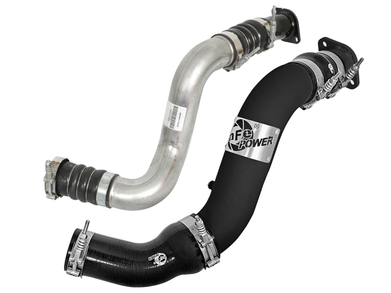 Flow and Performance: Constructed of 3" mandrel bent, powder-coated aluminum tubing for maximum flow. The smooth transition bends decrease turbulence and minimize pressure loss, increasing horsepower, torque and lowering EGT's. Installs on the Hot Side to transfer heated air smoothly to the intercooler to accelerate heat transfer for better performance. Perfect Fit: Utilizes the factory mounting locations to provide stability for a hassle-free installation. Includes high quality stainless steel spring loaded t-bolt clamps and heavy-duty 5-Ply couplings for strength. Fits OEM or aFe's upgraded intercooler (46-20281). aFe Badging: A unique stainless steel laser-cut aFe power logo plate is welded-on for an aggressive style. aFe Bladerunner 3in Intercooler Hot Side Tube for 16-17 Nissan Titan XD V8 5.0L (td). BladeRunner 3 IN Aluminum Hot Charge Pipe Black Nissan Titan XD 16-19 V8-5.0L (td). Incl. Stainless Steel Spring Loaded T-Clamps/Silicone Couplings. BladeRunner 3 IN Aluminum Hot Charge Pipe Black. Mandrel Bent Aluminum Tubing For Increased Flow. Incl. Hardware For A Hassle Free Installation. Powdercoat Wrinkle Black For Heat Resistance. Outflows Stock Charge Pipes By 13%. Works w/aFe Or Factory Intercooler. BladeRunner Hot Charge Pipe. Factory Mounting Locations. Hot Side Tube Fitment. Hot Charge Pipe