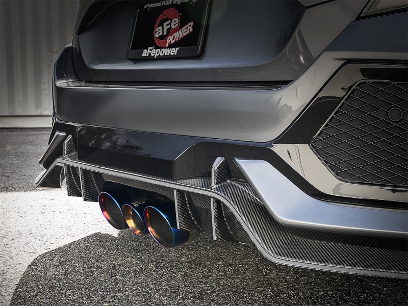 Even the latest-model sport compact vehicles have room for improvement and is why aFe POWER Takeda stainless steel cat-back exhaust system for the Honda Civic Type R L4-2.0L (t) engine is here to turn it up. In-house testing shows this Takeda exhaust system delivered gains of up to +19 HP/ +20 lbs. x ft. TQ and offers an aggressive growl under load! Constructed of 3" into 2 ½" mandrel bent, brush finished, 304 stainless steel tubing for improved performance flow, corrosion resistance and overall breath-taking appearance, it is 100% hand TIG-welded by certified craftsmen for race proven strength and durability. This uniquely designed system incorporates a resonator, du al free-flowing 304 stainless steel mufflers and a center "open-pipe" to improve performance across the power band while maintaining a smooth, deep tone. Dual 4 ½" and single 3 ½" Tip ("Tri-Tip") provides a track-ready, competitive look. Performance Gains: In house testing produced a max gain of +19 horsepower and +20 lbs. x ft. torque Brush Finished 304 Stainless Steel Construction: 3" into 2 ½" brush finished, mandrel bent 304 stainless steel tubing for maximum performance, corrosion resistance, durability and overall appearance. Mitered Merge Collector: A mitered collector separates exh aust gases into three individual tubes. This decreases turbulence and increase exhaust velocity resulting in increased horsepower, torque and improved throttle response. Smooth, Deep, Aggressive Sound: Uniquely designed, dual free-flowing 304 stainless steel mufflers and a center "open-pipe" to unle ash horsepower and torque gains across the power band while producing a powerful, smooth, deep tone. Tri-Carbon Fiber Tips: This system features two 4 ½" and one 3 ½" double-wall exhaust tips. The tri-carbon Tip or "Tri-Tip" completes the form and function of this Takeda exhaust system for a styl ish and competitive look. TIG-Welded: 100% TIG-Welded by certified craftsmen for race proven strength. Takeda 3 IN 304 Stainless Steel Cat-Back Exhaust System w/ Blue Flame Tip Honda Civic Type R 17-21 L4-2.0L (t). aFe Takeda 3in 304 SS Cat-Back Exhaust w/ Blue Flame Tips 2017+ Honda Civic Type R I4 2.0L (t). Takeda 3 IN 304 Stainless Steel Cat-Back Exhaust System w/ Blue Flame Tip. Takeda Cat-Back Exhaust System. 100 Percent Hand TIG-Welded. Mandrel Bent Tubing. Cat-Back Exhaust