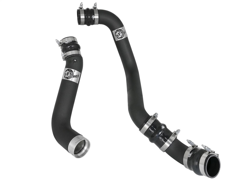 This BladeRunner intercooler tube kit delivers more flow and is more robust to handle higher horsepower and boost than the factory intercooler tubes on the 2017-2019 GM L5P diesel. TIG-welded and designed from aircraft-grade, mandrel bent aluminum tubing, the BladeRunner I/C tube kit features factory mounting locations, quality hardware and 5-ply silicone couplings for a secure, hassle free installation. Flow and Performance: Constructed from 3" and 3 1/2" aluminum tubing, both I/C tubes are mandrel bent and powder coated for maximum flow and performance. Smooth transition bends decrease turbulence and minimize pressure loss, increasing horsepower, torque and lowering EGT's. The BladeRunner I/C tube kit transfers hot air smoothly to the intercooler to accelerate heat transfer then cooled air to the engine to help make more power. Perfect Fit: Factory mounting locations, quality stainless steel spring-loaded T-Bolt clamps and heavy-duty 5-ply polyester reinforced silicone couplings ensure a secure install. The cold side tube includes a factory-style quick connect with an O-ring seal for a quick and simple install. 1/8" NPT ports are provided on each tube for connecting auxiliary sensors and retains the factory air temp sensor for a hassle-free installation. Custom Appearance: Finished in wrinkle-black powder coating and badged with a unique aluminum laser-cut aFe Power logo welded on for a custom look.. BladeRunner 3 IN & 3-1/2 IN Aluminum Hot and Cold Charge Pipe Kit Black GM Diesel Trucks 17-19 V8-6.6L (td) L5P. aFe BladeRunner 3in/3-1/2in Black Intercooler Tubes Hot/Cold 2017 GM Diesel Trucks V8 6.6L (td) L5P. Premium 5-ply silicone couplings rated at 200 PSI for long lasting durability. BladeRunner 3 IN & 3-1/2 IN Aluminum Hot and Cold Charge Pipe Kit Black. TIG-welded, 3 & 3 1/2 IN mandrel-bent aluminum tubing for better flow. Outflows factory I/C tubes by up to 38% for improved performance. 1/8 NPT ports are provided for connecting auxiliary sensors. Works with the factory intercooler. BladeRunner Charge Pipe Kit. Charge Pipe Kit
