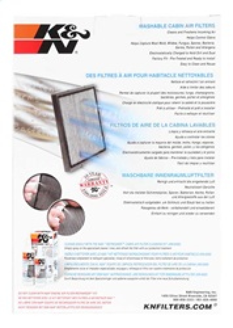 K&N washable cabin air filters are engineered to fit directly into your factory air box, offering excellent protection from environmental contaminants and odor-causing particles. The thermally bonded high-flow synthetic material acts as a physical barrier, helping trap dust, pollen, mold, bacteria, fungi, and other pollutants, and is specially pleated to increase the contaminant-capturing surface area. Each filter is engineered to install easily into your factory cabin air box, and is designed to be easily washed and reinstalled whenever necessary. Buy with confidence under the K&N 10-Year/Million Mile Limited Warranty.. K&N’s line of washable replacement cabin air filters are designed to filter your incoming air using state-of-the-art filtration technology - protecting your vehicle’s occupants, interior, and HVAC system from pollutants and unpleasant odors. Engineered to be washable, reusable, and durable, this cabin filter is designed to last for the entire lifespan of your vehicle!. Helps protect your vehicle's occupants, interior, and HVAC system from pollutants that can cause unpleasant odors. Engineered to be washable, reusable, and durable. DESIGNED FOR LONG-LASTING PERFORMANCE AND QUALITY