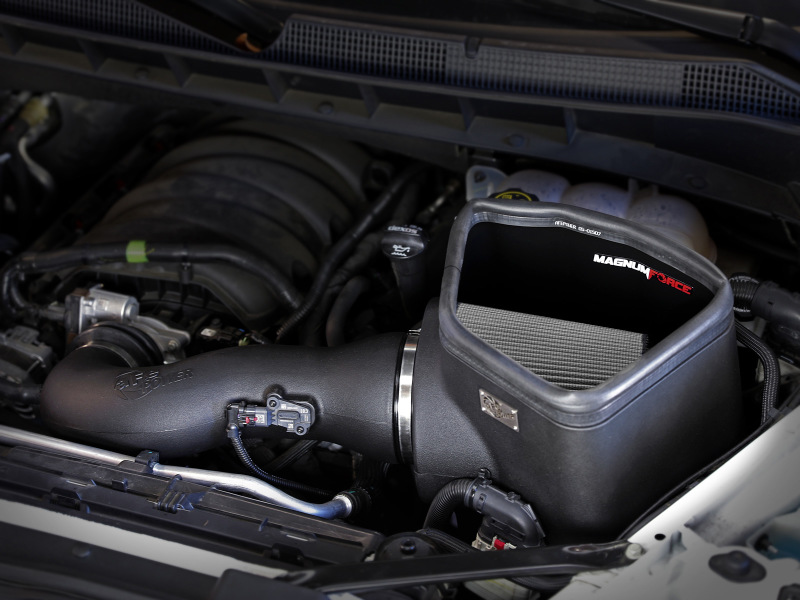 Large Three Layer Performance Air Filter: This 360-degree radial flow air filter features our oil-free Pro DRY S media with three layers of synthetic media for maximum convenience. Its progressive layering provides great filtration efficiency and dust holding capacity, while not requiring the use of oils. This media is best suited for street and light off-road use. Its inverted top makes for more filter surface area, resulting in longer service intervals.. Hassle-Free Installation: The computer designed system utilizes factory mounting locations, minimizing the use of unnecessary hardware and ensuring a perfect fit every time. Its innovative design makes for a hassle-free, direct bolt-on installation process that requires no cutting or drilling. Its revolutionary design, featuring our patent pending filter-to-housing interface, uses half the number of parts of a traditional cold air intake system.. One-Piece Housing: The included massive air filter is surrounded by an open-element XLPE polymer housing that minimizes warm engine air for maximum performance. Its open design allows for easy viewing of the air filter, yet creates a heat-blocking seal when the vehicle's hood is closed. It utilizes the vehicle's OE air inlet with no additional hardware.. Dyno-Tuned Intake Tube: This system features a high quality, computer-designed, dyno-tuned intake tube to achieve maximum power gains while maintaining a perfect fit. Its XLPE material is heat soak resistant and extremely durable.. Emissions Disclaimer: This product is not currently CARB exempt and is not available for purchase in California or for use on any vehicle registered with the California Department of Motor Vehicles.. Magnum FORCE Stage-2 Cold Air Intake System w/ Pro DRY S Filter GM Trucks/SUVs 19-25 V8-6.2L. Innovative Filter-to-Housing Interface and Minimal Hardware for Fast & Easy Installation. aFe MagnumFORCE Intake Stage-2 Pro Dry S 2019 GM Silverado/Sierra 1500 V8 6.2L. Magnum FORCE Stage-2 Cold Air Intake System w/ Pro DRY S Filter. Washable and Reusable Pro 5R Air Filter for Maximum Performance. Dyno-Proven Gains up to +8 HP & +14 Lbs. x Ft. TQ. Incorporates the Factory Air Inlet Scoop. Magnum FORCE Cold Air Intake System. Measured Flow: 685 CFM @ 7" H2O. Outflows Factory Intake by 36%. Magnum FORCE Intake. Open-Element Design