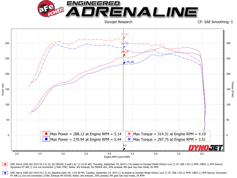 Large Five Layer Performance Air Filter:Momentum’s innovative filter-to-housing interface was built to feature the largest air filter possible. This 9" tall 360-degree radial flow air filter features a 5-1/2" flange and our pre-oiled Pro 5R media with five layers of progressively finer cotton gauze media for maximum performance. It provides your engine with the largest amount of high-flowing air and delivers the highest power gains in most cases. This media is perfect for street use. This filter's inverted top makes for more surface area, resulting in longer service intervals, while its expanded metal provides impact protection.Unique One-Piece Housing:The smooth one-piece sealed housing, constructed of heat-resistant cross-linked polyethylene (XLPE), features our patent-pending filter-to-housing interface. Its innovative design minimizes the total number of parts, making for an easy installation. A large, clear sight window allows for hassle-free filter inspection, without having to disassemble your system. The housing utilizes the factory air inlet, using no additional hardware, and features an optional auxiliary air inlet.Dyno-Tuned Intake Tube:This system features a high quality, computer-designed, dyno-tuned intake tube to achieve maximum power gains while maintaining a perfect fit. Its XLPE material is heat soak resistant and extremely durable.Hassle-Free Installation:Stainless-steel T-bolt clamps and a silicone coupler are included for strength and durability. Momentum GT intakes are designed with fewer parts for a fast and easy installation.. Clear Sight Window for Innovative Filter-to-Housing Interface for Convenient Filter Maintainence. Momentum GT Cold Air Intake System w/ Pro 5R Filter GM Silverado/Sierra 1500 19-25 L4-2.7L (t). aFe Momentum GT Pro 5R Cold Air Intake System 19 GM Silverado/Sierra 1500 V6-2.7L (t). Sealed Housing Utilizes Factory Air Inlet and Additional Optional Auxiliary Air Inlet. Premium T-Bolt Clamps and a Reinforced Coupler Provide a Secure Seal. Washable and Reusable Pro 5R Air Filter for Maximum Performance. Momentum GT Cold Air Intake System w/ Pro 5R Filter. Momentum GT Cold Air Intake System. Momentum GT Intake