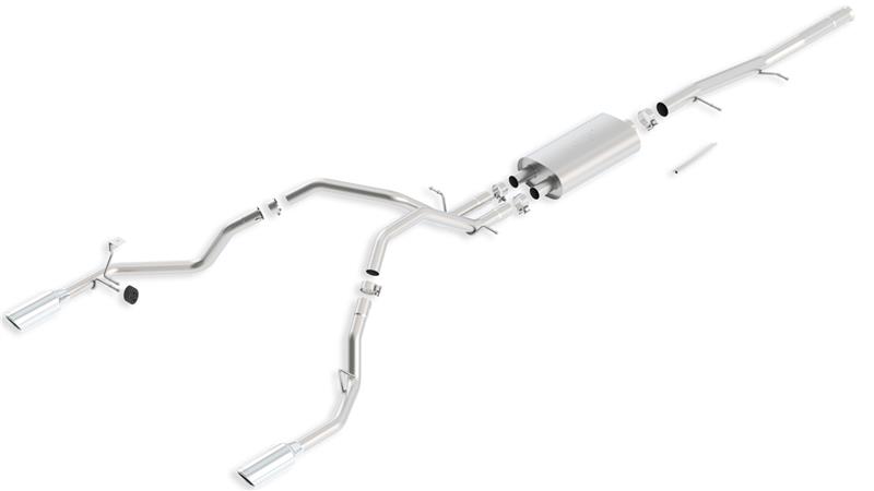 This 2.75" diameter into dual 2.25" Cat-Back(tm) system delivers the mellow Touring sound with no drone inside the vehicle. The system features single 4" round bright chrome on T-304 stainless steel tips on each tail pipe. Borla(r) Cat-Back(tm) & Axle-Back exhaust systems feature patented straight-through and multi-core technology designed to unleash hidden horsepower. Increased exhaust velocity adds power, driving excitement, fuel economy, and the distinctive Borla(r) Sound of Power respected by motoring enthusiasts everywhere. Each system is built from premium T-304 stainless steel, superior to T-400 series knockoffs (such as 409), to give you the absolute best in performance and durability. Ultra-smooth mandrel bends ensure maximum flow & power, and precision computer numerical control (CNC) manufacturing ensures an accurate fit. Best of all, Borla(r) stands behind every system with a Million-Mile Warranty. Just what you'd expect from the world's most experienced (and most winning) exhaust brand.. Borla Cat-Back and Rear Section exhaust systems feature patented straight through and multi-core technology to unleash hidden horsepower. Increased exhaust velocity adds power; driving excitement; fuel economy; and the distinctive Borla Sound of power respected enthusiasts everywhere. Each system is built from premium 300 series austenitic stainless steel; superior to T-400 series knockoffs; to give you the absolute best in performance and durability. Ultra smooth mandrel bends ensure maximum flow and power; and precision computer controlled CNC manufacturing ensures an accurate fit. Best of all Borla stands behind every system with a Million-Mile Warranty. Just what you would expect from the worlds most experienced and most winning exhaust brad.. S-Type Cat-Back(tm) Exhaust System 2009-2013 Chevrolet Silverado 1500/ GMC Sierra 1500 4.8/ 5.3L/ 6.0L V8 Automatic/ Manual Transmission 2/4WD Ext. Cab With Std. Bed (6' 7") 143.5" Wheelbase/ Crew Cab With Short Bed (5' 9") 143.5" Wheelbase. 2009-2013 Chevrolet Silverado 1500/ GMC Sierra 1500 4.8L/ 5.3L/ 6.0L V8 Automatic/ Manual Transmission 2 & 4WD 4 Door Extended Cab With Standard Bed (6' 7") 143.5" Wheelbase/ Crew Cab With Short Bed (5' 9") 143.5" Wheelbase.. Borla 09-11 Chevrolet Silverado / 09-11 GMC Sierra S-Type SS Catback Exhaust. Cat-Back(tm) Exhaust System - S-Type. S-Type; Cat-Backâ„¢ System. Million Mile Warranty. Borla Cat-Back System. Exhaust System Kit. Cat-Back System. ExhstSysKt. 240