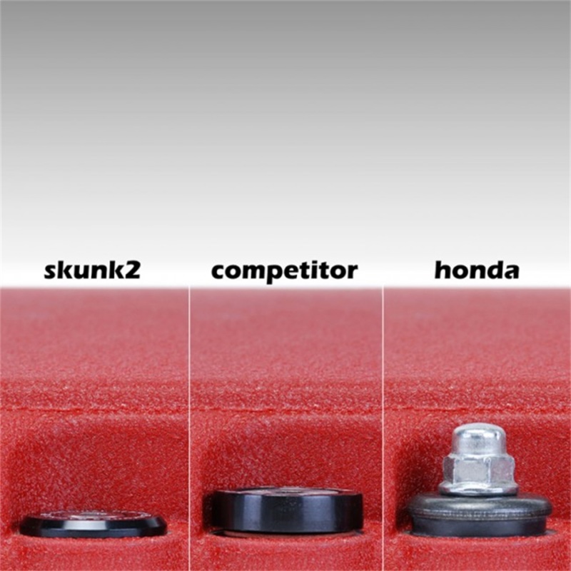 Skunk2 is proud to introduce the most unique, low-profile dress-up hardware you've ever seen. An original design, Skunk2's Low Profile Valve Cover Hardware kits are the only ones designed specifically for B-series valve covers. Low Profile Valve Cover Hardware kits are a comprehensive design, featuring specially engineered 'standoffs' that include provisions for Skunk2's unique, low-profile washers and flush-mounted, stainless steel hardware. Each kit includes 12 low-profile washers and 12 flush-mounted, stainless steel bolts. All kits are compatible with OEM valve covers as well as OEM and most aftermarket spark plug wire covers, including those from Skunk2. Each OEM-grade standoff replaces the factory mounting studs, allowing for the camshaft caps to be secured to factory specifications. No other valve cover kit available does this. A series of Viton O-rings and the appropriate standoff extensions are included with each kit to ensure a leak-free seal and OEM fit and finish. Only Skunk2's 40-piece Low Profile Valve Cover Hardware kits include washers and standoffs for all eight mounting points as well as for fastening most spark plug wire covers into place. And only Skunk2 offers the most low-profile washers and bolts around, measuring more than 75% thinner than the factory washer and nut combination. Skunk2's Low Profile Valve Cover Hardware kits are manufactured from 6061-T6 aluminum and are available for B-series VTEC engines in black, blue, gold, purple, red, and clear hard-anodized finishes, and feature Skunk2's classic, laser-etched logo. Skunk2 employs the same design and manufacturing methods for all of its Fine Tuning accessories as it does for its top-of-the-line racing components. Skunk2's Low-Profile Valve Cover Hardware kits help put that unique finishing touch onto the vehicle you work so hard to make perform well, and we make every effort to ensure that their style is consistent with our rich racing heritage.. Engine Bay Dress Up Valve Cover Hardware Kit; Low Profile; Incl. Stainless Steel Standoffs/Bolts/6061 Aluminum Washers/Viton O-Rings; Clear Anodized; 40 Pieces;. Skunk2 Honda/Acura B-Series VTEC Clear Anodized Low-Profile Valve Cover Hardware. Clear Anodized For Good Looks And Corrosion Resistance. Engine Bay Dress Up Valve Cover Hardware Kit. Low-Profile Billet Aluminum Washers. Flush-Mounted Stainless Steel Bolts. Viton O-Rings For A Leak-Free Seal. Specially Engineered Stand-Offs. Laser Engraved Logo. VlvCvrHardwareKit. 40 Pieces