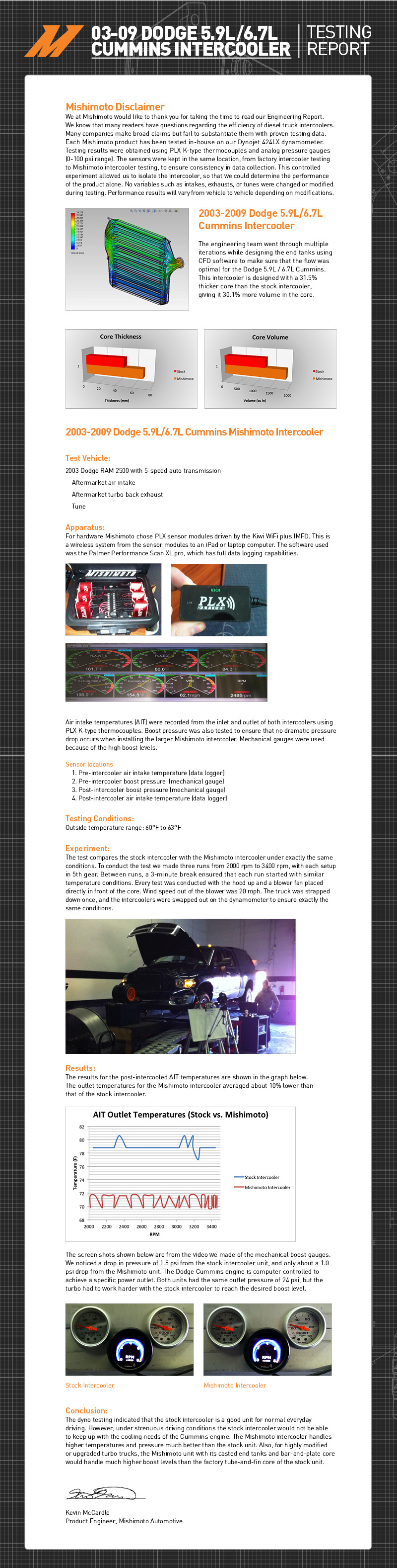 2003 Dodge Ram 2500 5.9 Liter 45RFE, 2003 Dodge Ram 2500 5.9 Liter 46RE, 2003 Dodge Ram 2500 5.9 Liter 47RE, 2003-2009 Dodge Ram 2500 5.9 Liter 48RE, 2004-2009 Dodge Ram 2500 5.9 Liter 545RFE, 2007-2009 Dodge Ram 2500 5.9 Liter 68RFE, 2007 Dodge Ram 2500 5.9 Liter AS68RC, 2005-2009 Dodge Ram 2500 5.9 Liter G56, 2004 Dodge Ram 2500 5.9 Liter NV3500, 2003-2005 Dodge Ram 2500 5.9 Liter NV4500, 2003-2004 Dodge Ram 2500 5.9 Liter NV4500HD, 2003-2005 Dodge Ram 2500 5.9 Liter NV5600, 2007-2009 Dodge Ram 2500 6.7 Liter 48RE, 2007-2009 Dodge Ram 2500 6.7 Liter 545RFE, 2007-2009 Dodge Ram 2500 6.7 Liter 68RFE, 2007 Dodge Ram 2500 6.7 Liter AS68RC, 2007-2009 Dodge Ram 2500 6.7 Liter G56, 2003 Dodge Ram 3500 5.9 Liter 45RFE, 2003 Dodge Ram 3500 5.9 Liter 46RE, 2003 Dodge Ram 3500 5.9 Liter 47RE, 2003-2009 Dodge Ram 3500 5.9 Liter 48RE, 2004-2009 Dodge Ram 3500 5.9 Liter 545RFE, 2008-2009 Dodge Ram 3500 5.9 Liter 68RFE, 2007-2009 Dodge Ram 3500 5.9 Liter AS68RC, 2005-2009 Dodge Ram 3500 5.9 Liter G56, 2004 Dodge Ram 3500 5.9 Liter NV3500, 2003-2005 Dodge Ram 3500 5.9 Liter NV4500, 2004 Dodge Ram 3500 5.9 Liter NV4500HD, 2003-2005 Dodge Ram 3500 5.9 Liter NV5600, 2007-2009 Dodge Ram 3500 6.7 Liter 48RE, 2007-2009 Dodge Ram 3500 6.7 Liter 545RFE, 2008-2009 Dodge Ram 3500 6.7 Liter 68RFE, 2007-2009 Dodge Ram 3500 6.7 Liter AS68RC, 2007-2009 Dodge Ram 3500 6.7 Liter G56. The Dodge Cummins inline-6 is well known for its smooth power delivery and engine longevity.Mishimoto has released an intercooler for the 2003-2009 5.9/6.7 Cummins that is built to last, just like your truck.The Mishimoto intercooler is manufactured with robust cast aluminum end tanks and a dense bar-and-plate core.This intercooler allows for decreased intake temperatures, improved airflow, and reduced pressure loss.Our engineers developed an intercooler with increased core volume that can support substantial boost pressures and lower EGTs in your stock or modified truck.Compared to factory units, the Mishimoto intercooler features larger outlets for increased airflow.This intercooler includes two silicone boots with DuraCore technology and our signature constant-tension T-bolt clamps for consistent and durable holding power.Mishimoto DuraCore technology is the synthetic material that comprises the innermost layer of all Mishimoto silicone diesel boots.Compared to normal silicone, DuraCore provides superior resistance to heat, pressure, fuel, and oil.This effectively increases the life of our boots by preventing leaks and blowouts.Offered in black or silver, the Mishimoto 5.9L/6.7L Cummins intercooler is protected by our signature lifetime warranty.. Mishimoto 03-09 Dodge 5.9L/6.7L Cummins Intercooler (Black). Bar-and-plate construction with cast aluminum end tanks. End tanks strategically designed for optimal airflow. Intercooler, fits Dodge 5.9L/6.7 Cummins 2003-2009. Larger than factory outlets allow increased flow. Dodge 5.9L/6.7 Cummins Intercooler. Mishimoto MMINT-RAM-03BK. Intercooler Kit