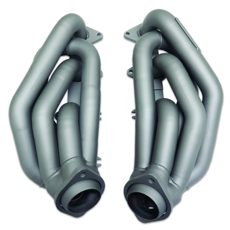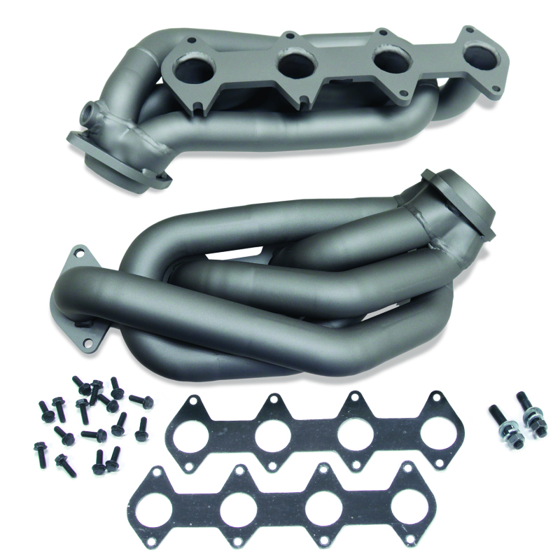 These BBK Performance shorty tuned Length exhaust Headers are designed and constructed as direct fit replacements for all 2005-10 Mustang GT applications. Each header is manufactured with 1-5/8 in. CNC mandrel bent tubing that offers unrestricted exhaust flow for increased horsepower and torque over factory OEM manifolds. BBK tuned Length headers offer improved scavenging waves for better combustion, which leads to improved performance and fuel economy over stock or equal Length headers. As with all BBK Performance exhaust headers they feature a 3/8 in. laser cut flange for additional strength and a guaranteed leak free fit. All headers are robotically and precision hand welded and then pressure tested to ensure years of reliability and performance in the real world. All BBK exhaust headers are available in a high temp titanium ceramic or polished silver ceramic coated finish and include new exhaust header gaskets, header bolts and hardware to complete the installation.. These BBK Performance shorty tuned Length exhaust Headers are designed and constructed as direct fit replacements for all 2005-10 Mustang GT applications. Each header is manufactured with 1-5/8" CNC mandrel bent tubing that offers unrestricted exhaust flow for increased horsepower and torque over factory OEM manifolds. BBK tuned Length headers offer improved scavenging waves for better combustion, which leads to improved performance and fuel economy over stock or equal Length headers. As with all BBK Performance exhaust headers they feature a 3/8" laser cut flange for additional strength and a guaranteed leak free fit. All headers are robotically and precision hand welded and then pressure tested to ensure years of reliability and performance in the real world. All BBK exhaust headers are available in a high temp titanium ceramic or polished silver ceramic coated finish and include new exhaust header gaskets, header bolts and hardware to complete the installation.. All BBK Performance parts are backed by a 1-YEAR manufacturer’s warranty from the original date of purchase. An optional extended warranty is also available - giving you an additional 2 or 3 years from original date of purchase. Costs for the extended warranty option can be viewed when the item is added to your cart. The manufacturer’s warranty is based on normal use and installation of each product.. Shorty Tuned Length Exhaust Header Kit; CNC-Series Performance; CNC Mandrel Bent 1.625 in. Tubing; Direct Fit Design; Incl. New Gaskets/Hardware; Titanium Ceramic;. BBK 05-10 Mustang 4.6 GT Shorty Tuned Length Exhaust Headers - 1-5/8 Titanium Ceramic. Direct Fit Replacement - 50 State Legal - CARB Approved - Titanium Ceramic Finish. 2005-2010 MUSTANG GT 1-5/8 SHORTY TUNED LENGTH HEADERS (TITANIUM CERAMIC). Shorty Tuned Length Exhaust Header Kit. Designed and Manufactured in USA. BBK Exhaust Headers. Exhaust Headers. Exhaust Header. Headers-Shorty