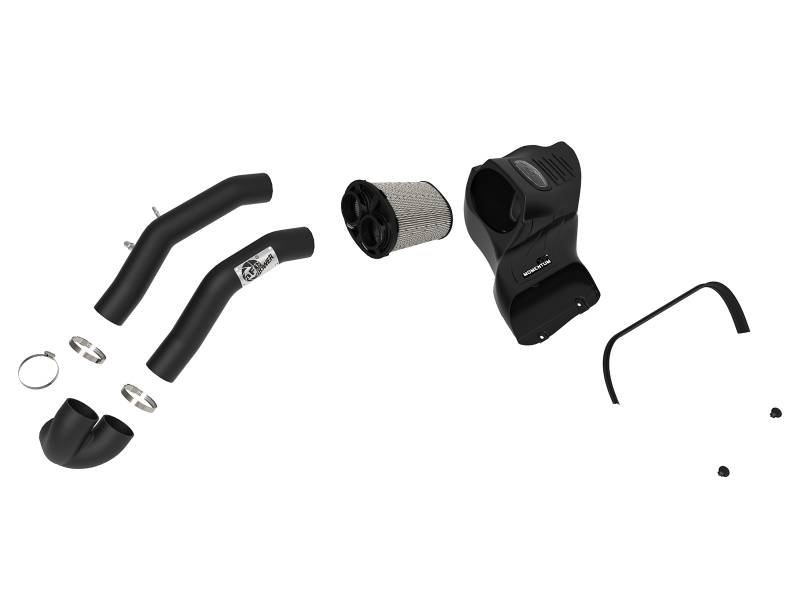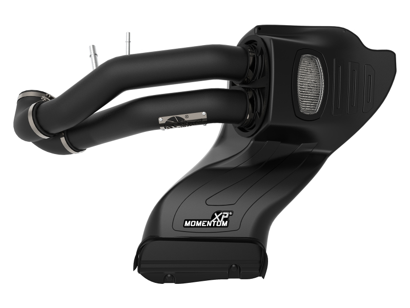 One-Piece Housing with Sight Window:A custom computer designed housing eliminates the use of multiple components. It’s roto-molded and made from heat soak resistant cross-linked polyethylene, ensuring the coolest air intake charge possible. A clear sight window allows for filter inspection without removal of the airbox. The housing is designed to retain the same stock mounting points as the OE intake system for a hassle-free installation.Dual Inlet Large 3-Layer Performance Air Filter:This sealed intake system utilizes a radial flow performance air filter with three oil-free progressive synthetic media layers for maximum convenience. The unique filter-to-housing interface allows for maximum filter size which increases the available air volume while simplifying the installation process.Dual 3" Mandrel-Bent Tubes w/ Custom Silicone Coupling:Dual mandrel-bent wrinkle-black powder-coated aluminum intake tubes direct unrestricted airflow from the filter to the throttle body for more horsepower and torque. A custom reinforced silicone coupling merges the dual tubes into a single outlet to connect to the throttle body.Premium Hardware:Premium stainless-steel worm-gear clamps provide the best corrosion resistance possible. Momentum XP intakes are designed with fewer parts for a quick and simple installation.. Get a custom look under the hood with this Momentum XP Cold Air Intake System. With stealthy dual wrinkle-black aluminum intake tubes and a custom dual inlet air filter, this thing is sure to turn heads.. Momentum XP Cold Air Intake System w/ Pro DRY S Filter Ford F-150 15-20 V8-5.0L. aFe Momentum XP Pro DRY S Cold Air Intake System w/ Black Aluminum Intake Tubes. One-Piece Roto-Molded Housing Captures Air Directly from the Front of the Truck. Enjoy Lifelong Convenience with a Washable and Reusable Pro DRY S Air Filter. Clear Sight Window Provides Easy Filter Inspection Without Disassembly. Unique Filter-to-Housing Interface for an Easy Installation. Momentum XP Cold Air Intake System w/ Pro DRY S Filter. Momentum XP Cold Air Intake System. Momentum XP Intake