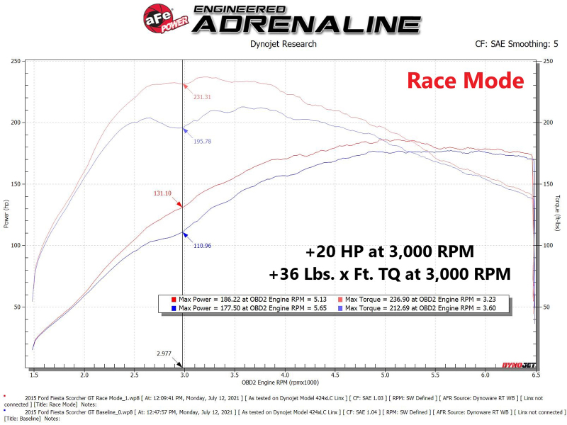 A simple 30 minute install will give you a huge increase in power. The aFe POWER SCORCHER GT Module includes a high quality case & wire harness with factory style connectors for an easy plug & play installation. A LED light switch provides In-Cabin On-The-Fly power adjustments. The 4-Power settings are adjustable with one button and the LED light represent the settings: Stock (Green), Sport (Yellow), Sport+ (Orange) and Race (Red) . This performance module increase turbo boost. It improves vehicle performance and throttle response. In testing, this module resulted in a gain of +20 HP and +36 Lbs. x Ft. of torque, verified by our in house dyno. This quick and easy plug & play SCORCHER GT module adds significant power by altering pressure sensor signals to increase turbo boost to improve vehicle efficiency, power and throttle response. SCORCHER GT modules features In-Cabin On-the-Fly power adjustment to accommodate any situation. This adjustment is controlled by via LED light switch with a button that can be easily mounted in any location in the cabin. aFe SCORCHER GT modules uses high quality aluminum extrusion black powder-coated enclosure casing and factory style connectors which requires no modification to your factory harness. These factory style connectors, plugs directly into the stock wiring harness connectors and sensors. SCORCHER GT modules are 100% tested for proper protection. These modules work amazingly on stock vehicles and are optimized for maximum performance with use of aFe POWER performance products. aFe POWER does not recommend using this device in conjunction with any other tuners or modules. Sport or Sport + settings are recommended when towing.. Dyno tested and produced significant power increases of +20 HP / +36 lbs. x ft. torque in race mode at 4,000 RPM. 4-power position settings: Stock (Green), Sport (Yellow), Sport+ (Orange) and Race (Red). Increase turbo boost to improve vehicle performance, efficiency and throttle response. Quick and easy plug & play installation without any modifications. In-Cabin On-the-Fly Power Adjustments via LED light switch. SCORCHER GT Power Module Ford Fiesta ST 14-19 L4-1.6L (t). High quality case & wire harness w/ OEM style connectors. Compatible with other aFe POWER performance products. aFe Scorcher Module 14-19 Ford Fiesta ST L4-1.6L. High reliability, 100% of units tested. Leaves no trace on ECU (No Footprint). Around 30 minute installation. SCORCHER GT Power Module. Power Module