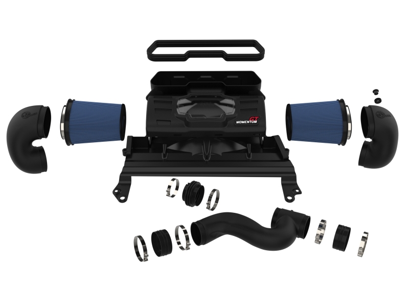 A pair of 360-degree radial flow air filters feature our pre-oiled Pro 5R media with five layers of progressively finer cotton gauze media for maximum performance. Our Pro 5R media provides your engine with the largest amount of high-flowing air, usually resulting in the highest power gains out of all other filter media options. This media is perfect for street use. The inverted tops make for more filter surface area, resulting in longer service intervals. Momentum’s innovative filter-to-housing interface was built to feature the largest air filter possible. Once the system is installed, the air filters can be easily removed from the housing for maintenance by only uninstalling the side intake tubes. The smooth one-piece sealed housing, constructed of heat-resistant cross-linked polyethylene (XLPE), features our patent pending filter-to-housing interface. Its innovative design minimizes the total number of parts, making for an easy installation. A massive clear sight window allows for hassle-free filter inspection without having to disassemble your intake system. The housing incorporates both the factory hood air inlet scoop and the grille inlet using no additional hardware. This system features a trio of high quality, computer-designed, dyno-tuned intake tubes to achieve maximum power gains while maintaining a perfect fit. Our XLPE material is heat soak resistant and extremely durable. Stainless-steel clamps are included for strength, and a premium silicone coupling allows for ample flexibility and durability. Momentum GT intakes are designed with fewer parts for a fast and easy installation.. Premium Clamps and a Silicone Couplings Provide a Secure Seal and Excellent Durability. Momentum GT Cold Air Intake System w/ Pro 5R Filter RAM 1500 TRX 21-24 V8-6.2L (sc). Massive Clear Sight Window for Convenient Filter Inspection Without Disassembly. aFe Momentum GT Pro 5R Cold Air Intake System 2021 RAM 1500 TRX V8-6.2L SC. Sealed Housing Incorporates Factory Hood Inlet Scoop and Grille Air Inlet. Washable and Reusable Pro 5R Air Filter for Maximum Performance. Innovative Filter-to-Housing Interface for Easy Installation. Momentum GT Cold Air Intake System w/ Pro 5R Filter. Momentum GT Cold Air Intake System. Momentum GT Intake