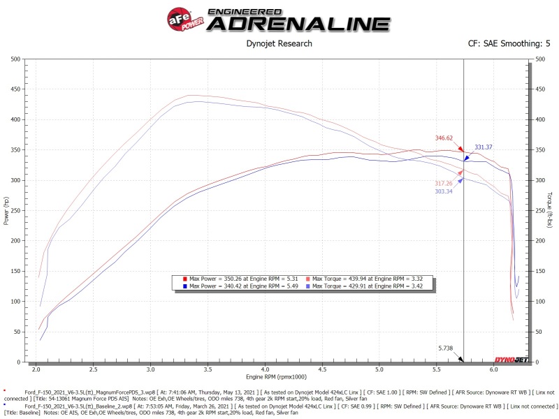 This 9” tall 360-degree radial flow air filter features a 5-1/2" flange and our oil-free Pro DRY S media with three layers of synthetic media for maximum convenience. Its progressive layering provides great filtration efficiency and dust holding capacity, while not requiring the use of oils. This media is best suited for street use. Its inverted top makes for more filter surface area, resulting in longer service intervals. The included massive air filter is surrounded by an open-element XLPE (cross-linked polyethylene) polymer housing that minimizes warm engine air for maximum performance. Its open design allows for easy viewing of the air filter and delivers an aggressive Air Intake sound. It utilizes the vehicle's OE air inlet with no additional hardware. The built-in air intake scoop captures cold air directly from the top of the radiator support thanks to its huge opening. This system features a high quality, computer-designed, dyno-tuned intake tube to achieve maximum power gains while maintaining a perfect fit. Its XLPE material is heat soak resistant and extremely durable. The computer designed system utilizes factory mounting locations, minimizing the use of unnecessary hardware, and ensuring a perfect fit every time. Its innovative design makes for a hassle-free, direct bolt-on installation process that requires no cutting or drilling. Stainless-steel clamps are included for strength, and premium silicone couplings allow for ample flexibility. Magnum Force intakes are designed with fewer parts for a fast and easy installation. Housing with built-in air intake scoop to capture cold air directly from the top of radiator support. Magnum FORCE Stage-2 Cold Air Intake System w/ Pro DRY S Filter Ford F-150 21-25 V6-3.5L (tt). Open-Element Design Showcases the Air Filter and Delivers an Aggressive Air Intake Sound. Innovative Filter-to-Housing Interface for Easy Installation (Roughly 30 Minutes). Premium Stainless-Steel Clamps and Silicone Couplings Provide a Secure Seal. Utilizes Factory Mounting Locations for an Easy and Secure Installation. aFe MagnumFORCE Intake Stage-2 Pro DRY S 2021 Ford F-150 V6-3.5L (tt). Washable and Reusable Pro DRY S Air Filter for Maximum Convenience. Magnum FORCE Stage-2 Cold Air Intake System w/ Pro DRY S Filter. Dyno-Proven Gains up to +15 HP and +14 Lbs. x Ft. TQ. Magnum FORCE Cold Air Intake System. Measured Flow: 730 CFM @ 7" H20. Outflows Factory Intake by 47%. Magnum FORCE Intake