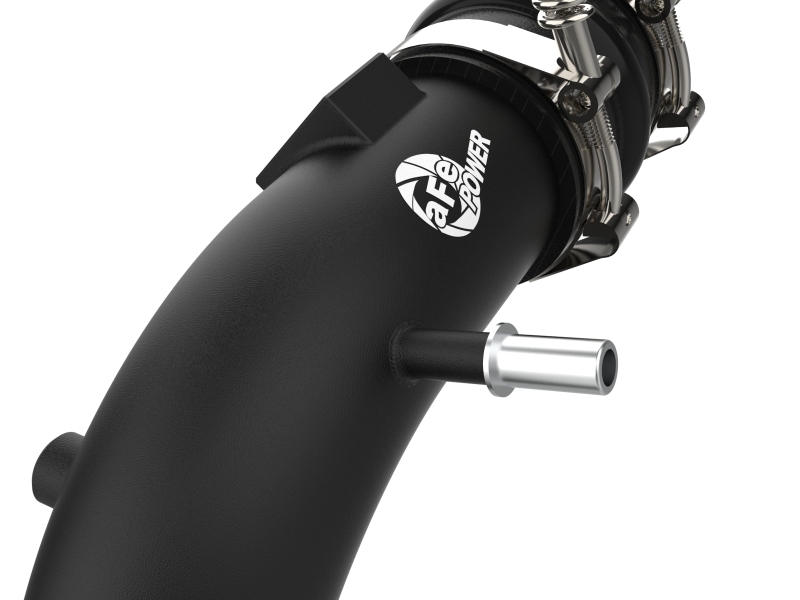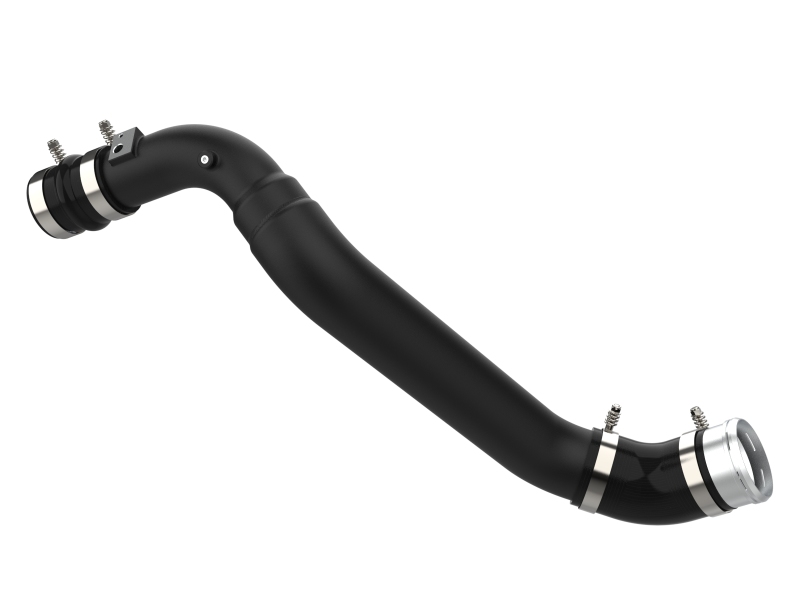 Smooth transitions in the mandrel-bent aluminum pipes decrease turbulence and minimize pressure loss, increasing horsepower and torque. The BladeRunner charge pipe kit provides a smooth transition between the turbo and the engine for lower operating temperatures and increased power. This charge pipe kit features a factory style billet aluminum quick-connect adapter with an o-ring seal to ensure a leak-free fit while maintaining superior strength and durability. Finished in wrinkle black powder coating with a unique laser-etched aFe POWER logo for a custom look.. Directly replace your F-150’s restrictive plastic charge pipes with aFe's BladeRunner free-flowing, heat-resistant aluminum pipes. BladeRunner 3-1/2 IN to 2-3/4 IN Aluminum Cold Charge Pipe Black Ford F-150 21-24 V6-2.7L (tt). aFe Bladerunner Intercooler Cold Charge Pipe Black 3.5-2.75in 2021+ Ford F-150 V6-2.7L (tt). Features Premium Stainless-Steel Spring-Loaded T-Bolt Clamps And 5-Ply Silicone Couplings. TIG-Welded 2" to 2-1/2" Hot Side and 3-1/2" to 2-3/4" Cold Side Aluminum Pipes. 1/8" NPT Ports are Provided for Connecting Sensors or Water Methanol Injection. BladeRunner 3-1/2 IN to 2-3/4 IN Aluminum Cold Charge Pipe Black. Powder Coated Wrinkle Black for Heat and Corrosion Resistance. Hot Side Outflows the Factory Charge Pipes by up to +16%. Cold Side Outflows the Factory Charge Pipe by up to +11%. Features Factory Style Quick-Connect With an O-Ring. BladeRunner Cold Charge Pipe. Cold Charge Pipe