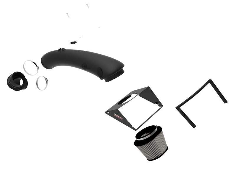 This 5-3/4” tall 360-degree radial flow air filter features a 5-1/2" flange and our oil-free Pro DRY S media with three layers of synthetic media for maximum convenience. Its progressive layering provides great filtration efficiency and dust holding capacity, while not requiring the use of oils. This media is best suited for street use. Its inverted top makes for more filter surface area, resulting in longer service intervals.aFe POWER developed this heat shield to snap onto the top of the lower half of the factory air box to provide a hassle-free installation utilizing factory mounting locations. This system features a high quality, computer-designed, dyno-tuned intake tube to achieve maximum power gains while maintaining a perfect fit. Its XLPE (cross-linked polyethylene) material is heat soak resistant and extremely durable. The computer designed system utilizes factory mounting locations, minimizing the use of unnecessary hardware, and ensuring a perfect fit every time. This is a direct bolt-on kit that requires no cutting or drilling on factory parts. Stainless-steel clamps are included for strength, and a premium silicone coupling allow for ample flexibility. This air intake system works perfectly in combination with aFe POWER D.A.S. (Dynamic Air Scoop): 52-10010S(Black), 52-10010SR(Red) and 52-10010SL(Blue).. Powder-Coated One-Piece Heat Shield Mounts to Lower Half of Factory Airbox for Easy Installation. Premium Stainless-Steel Clamps and a Silicone Coupling are used for Strength and Durability. aFe Rapid Induction Cold Air Intake System w/Pro DRY S Filter 2021+ Ford F-150 V8-5.0L. Rapid Induction Cold Air Intake System w/ Pro DRY S Filter Ford F-150 21-25 V8-5.0L. Washable and Reusable Pro DRY S Air Filter for Maximum Convenience. No Cutting or Drilling on OEM Parts for Faster Installation. Rapid Induction Cold Air Intake System w/ Pro DRY S Filter. Computer-Designed Roto-Molded Intake Tube. Rapid Induction Cold Air Intake System. Cold Air Intake