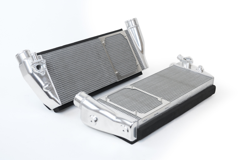 The Ferrari 488/Pista/F8 Intercoolers were carefully designed and engineered to fit exactly like the OEM units they replace. The installation uses all the factory mounting points, shrouds, and fans for a true "drop-in fitment". No cutting or other modifications are required. CSF pre-installs a high density foam to seal the area around the intercoolers just like the factory units. One of the challenges of designing a true drop-in system is the size limitations. While most aftermarket intercoolers achieve a good percentage of their improved efficiency with increased size, the CSF by PWR Intercoolers rely on an ultra efficient core. PWR manufactures and uses these same cores on the intercoolers it supplies for the majority of Formula-1 race teams.. The intercooler cores are spec'd out by CSF and custom built by PWR. Featuring two rows of rolled cooling tubes with inner fins, these cores make for the most efficient intercoolers available. Because of this, they are able to eliminate heat soak and lower IATs much more efficiently than traditional Bar & Plate or Tube & Fin designs. This gives us maximum performance for extended periods of time under demanding driving conditions and for vehicles with increased power levels through modifications and tuning.. The CSF #8210 Cooling product is designed to be a "Drop-In Fit" application. The product will install in the OEM Location with no modifications necessary unless otherwise noted or instructions are included in the product package. Please see the manufacturer repair manual for standard installation instructions. If you do not feel confident installing this product CSF recommends taking it to a qualified installation facility.. The CSF Intercoolers feature 100% TIG-welded machined billet aluminum end tanks. This feature is not only aesthetically pleasing, but also offers improved longevity and durability. The CNC machined billet end tanks are ready to withstand increased boost pressures from higher performance tunes, as well as upgraded turbochargers.. With multiple tunes available for the Ferrari 488/Pista/F8, there was an obvious demand for upgraded cooling systems. A big limiting factor in tuning has been high Intake Air Temperatures (IATs) produced by the turbos which already generate around 35 PSI of boost from the factory.. The CSF by PWR 488/F8 Twin Intercooler Set features Formula-1 grade cores which offer the greatest reduction in IATs and help eliminate heat soak. The Billet Aluminum construction offers the greatest strength and durability possible.. Eliminates Heat Soak and Lower Intake Air Temperatures (IATs) for Maximum Performance in High-Performance and Race Conditions. R&D and Performance Testing by Industry-Leading Tuning Companies M-Engineering, World Motorsports, and Voodoo Design. The CSF #8210 comes in a raw billet aluminum finish. Also available in Thermal Black Heat Dispersion (CSF #8210B).. Formula-1 Performance Grade Cores by PWR (2-Row Cores features Rolled Tubes w/ Inner Fins). CSF 16-19 Ferrari 488 GTB/Spider 19-20 Pista High Performance Intercooler System - Raw. True Plug-and-Play "Drop-in Fit" Installation - Requires Absolutely No Modifications. 100% TIG Welded CNC Machined Billet End Tanks for Maximum Strength & Durability. OEM Style Inlet/Outlet Connections for Precise Fitment With All OEM Components. Ferrari 488 / Pista / F8 Twin Intercooler Set - Raw Billet. Precision machined integrated BPV/BOV connection. High density foam installed for OEM Fit & Finish. Sold as a pair (Left & Right Intercoolers). Made in the USA at PWR North America. CSF 8210 - 488/F8 Intercooler (Raw). Integrated OEM Style Fan Shroud. CSF Intercooler. Intercooler