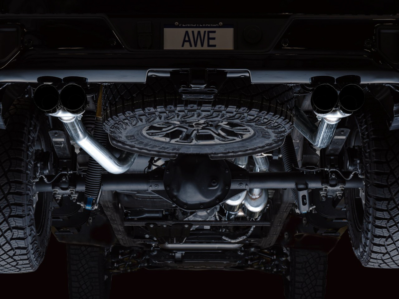 The 0FG is a dual 3” T304L stainless steel Cat Back configuration featuring a bespoke H-pipe and AWE’s patented drone-canceling 180 Technology®. Together, combined with precision fitment, class-leading rigidity, and signature 4” slash cut tips, you’re looking at the Best Sounding Exhaust on the Planet™ for the Silverado ZR2 and Sierra AT4X. American-sourced T304L stainless steel with a wall thickness of .065” runs smoothly from front to back, connecting right after the factory emissions equipment. An H-pipe tailored specifically for the 6.2L is met shortly after to provide an aggressive and rich muscle tone with minimal rasp before filtering through the 180 Technology® resonators to destroy drone-prone frequencies while maintaining optimal performance. Finishing things off on this kit are quad 4” double-walled, slash-cut tips, offered in chrome silver or diamond black, exiting under the rear bumper. AWE also made it easy to swap the rear portions of the 0FG to add the BashGuard (sold separately) at any time. This truly is the ultimate exhaust set up for any ZR2 or AT4X. AWE's No CEL Guarantee, Perfect Fitment Guarantee, and Lifetime Warranty come standard.. AWE Tuning 22-23 GMC Sierra 1500 AT4X 6.2L 0FG Catback Split Dual (Flat Bumper) - Diamond Black Tips. Handcrafted from CNC mandrel-bent, U.S.-sourced .065”-wall T304L stainless steel. AWE 0FG Catback Exhaust for Silverado ZR2/Sierra AT4X - Quad Diamond Black Tips. Dual 3” catback configuration engineered specifically for the ZR2 and AT4X. Quad tip outlets feature ball & socket joints for ultimate adjustability. AWE 0FG Catback for Silverado ZR2/Sierra AT4X - Quad Diamond Black Tips. Less is more: clean, straight-through design for maximum performance. Features AWE’s patented drone-canceling solution, 180 Technology®. Engineered for life, ready for any scenario on the planet. Tailored H-pipe for deep, refined V8 muscle tone. Quad 4-inch tips in Diamond Black. Perfect Fitment Guarantee. AWE No CEL Guarantee. Lifetime Warranty. 0FG Catback