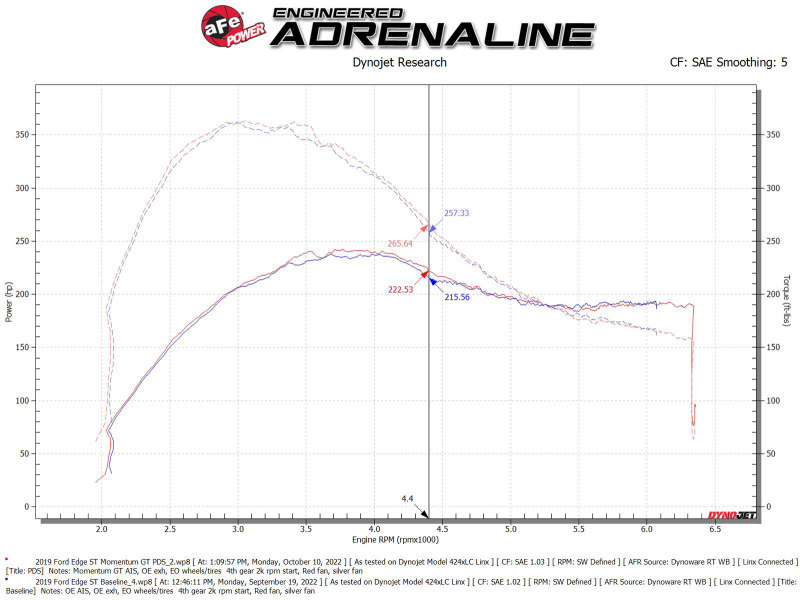 This 360-degree radial flow air filter features our oil-free Pro DRY S media with three layers of synthetic media for maximum convenience. Its progressive layering provides great filtration efficiency and dust holding capacity, while not requiring the use of oils. This media is best suited for street and light off-road use. Its inverted top makes for more filter surface area, resulting in longer service intervals. The smooth one-piece sealed housing, constructed of heat-resistant cross-linked polyethylene (XLPE), features our patented pending filter-to-housing interface. Its innovative design minimizes the total number of parts, making for an easy installation. A large, clear sight window allows for hassle-free filter inspection, without having to disassemble your system. This system features high quality, computer-designed, dyno-tuned intake tube to achieve maximum power gains while maintaining a perfect fit. Its XLPE material is heat soak resistant and extremely durable. A stainless-steel clamp is included for strength, and a premium EPDM inlet trim allows for a precise seal. Momentum GT intakes are designed with fewer parts for a fast and easy installation.. aFe 19-23 Ford Edge ST EcoBoost V6-2.7L (tt) Momentum GT Cold Air Intake System w/ Pro DRY S Filter. Momentum GT Cold Air Intake System w/ Pro DRY S Filter Ford Edge ST 19-24 V6-2.7L (tt). Clear Sight Window for Convenient Filter Inspection Without Disassembly. Utilizes Factory Mounting Locations for an Easy and Secure Installation. Washable and Reusable Pro DRY S Air Filter for Maximum Convenience. Innovative Filter-to-Housing Interface for Easy Installation. Momentum GT Cold Air Intake System w/ Pro DRY S Filter. Momentum GT Cold Air Intake System. Premium Clamp and EPDM Inlet Trim. Momentum GT Intake