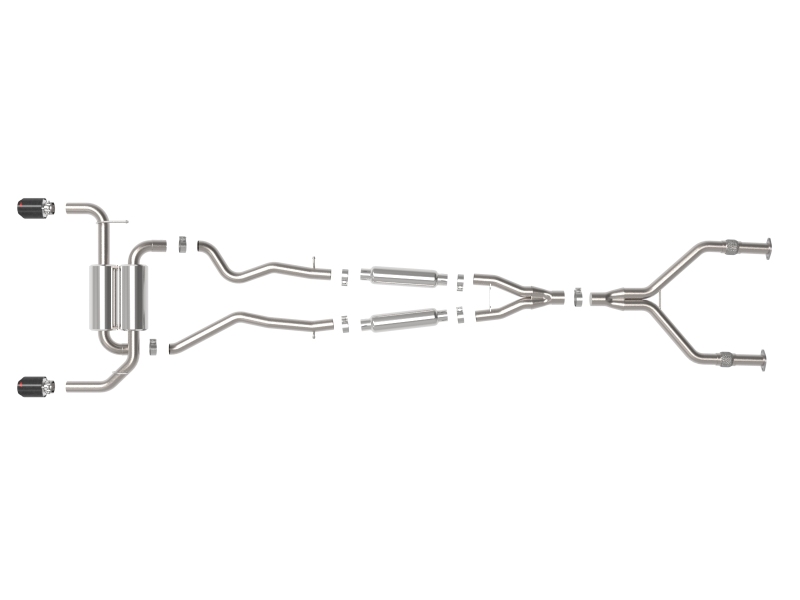 This cat-back system is constructed from 2-1/2" mandrel-bent 304 stainless steel tubing and features high-flow polished 304 stainless mufflers to improve flow and produce an aggressive tone without requiring cutting or modification. The system uses factory-style flanges and hangers for a direct bolt-on installation and comes with all necessary hardware. Dual 4-1/2" carbon fiber-wrapped stainless clamp-on tips, each marked with the aFe POWER logo, provide a distinctive finish and added corrosion resistance. CAD-guided fitment and 100% MIG welding ensure consistent build quality and long-term durability.