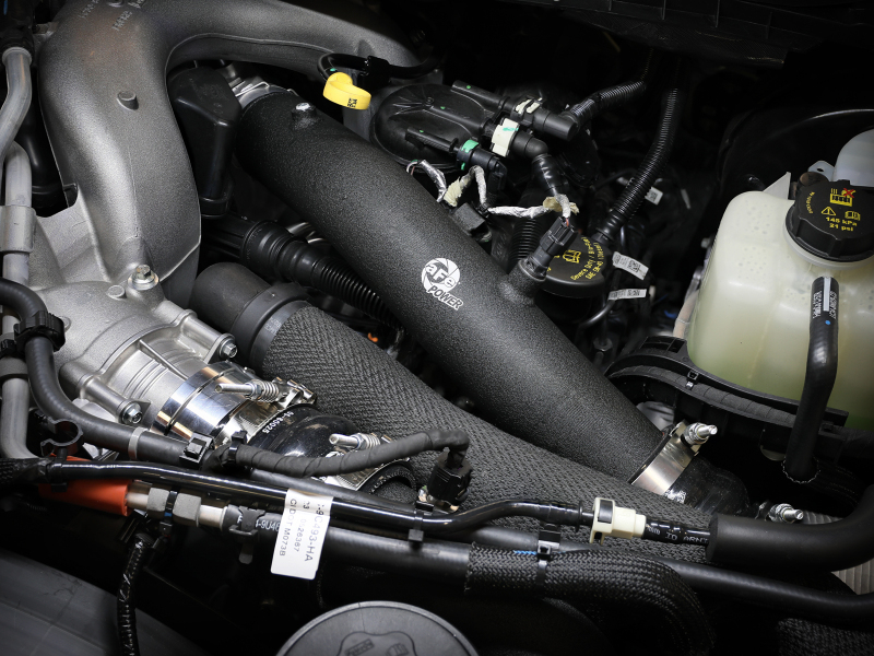 aFe POWER BladeRunner Charge Pipes feature smooth transitions in the mandrel-bent aluminum pipes to decrease turbulence and minimize pressure loss, lowering operating temperatures and increasing power. The factory-style billet aluminum quick-connect adaptors with o-ring seals ensure a leak-free fit while maintaining superior strength and durability. The premium stainless-steel hardware and heavy-duty 5-ply polyester reinforced silicone couplings are designed to withstand high vibration and heat tolerance for an added security. Finished in a powder coated surface and laser-etched aFe POWER logo these charge pipes provide a custom look.. Directly replace your Super Duty's restrictive charge pipe with aFe POWER's BladeRunner free-flowing, heat-resistant aluminum charge pipe.. BladeRunner 3 IN Aluminum Hot Charge Pipe Black Ford Diesel Trucks 23-25 V8-6.7L (td) High Output. aFe 23-24 Ford F250/F350 Super Duty V8-6.7L BladeRunner 3 In. Aluminum Hot Charge Pipe- BLK. Features Premium Stainless-Steel Spring-Loaded T-Bolt Clamps And a 5-Ply Silicone Coupling. 1/8" NPT Port is Provided for Connecting Sensors or Water Methanol Injection. Powder Coated Wrinkle Black for Heat and Corrosion Resistance. Features Factory Style Quick-Connect With an O-Ring Seal. BladeRunner 3 IN Aluminum Hot Charge Pipe Black. BladeRunner Hot Charge Pipe. TIG-Welded 3" Aluminum Pipe. Hot Charge Pipe